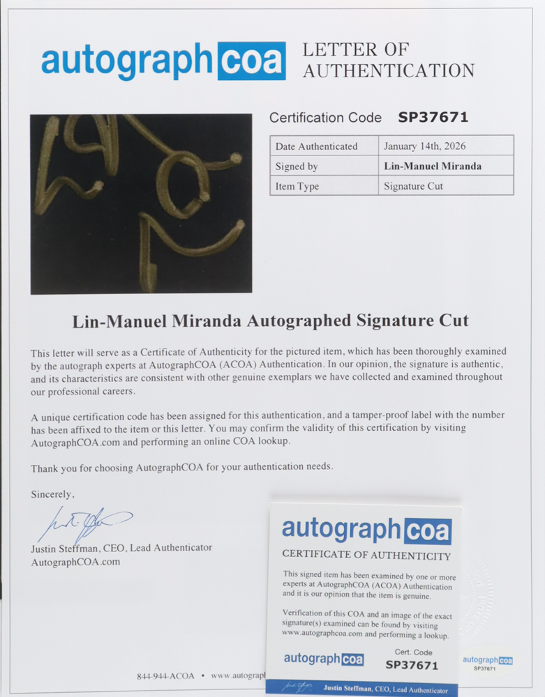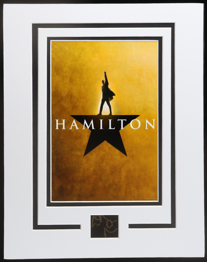 Custom photo display measures approximately 11" x 14" in size and features a cut that has been hand-signed by Lin-Manuel Miranda (Alexander Hamilton).