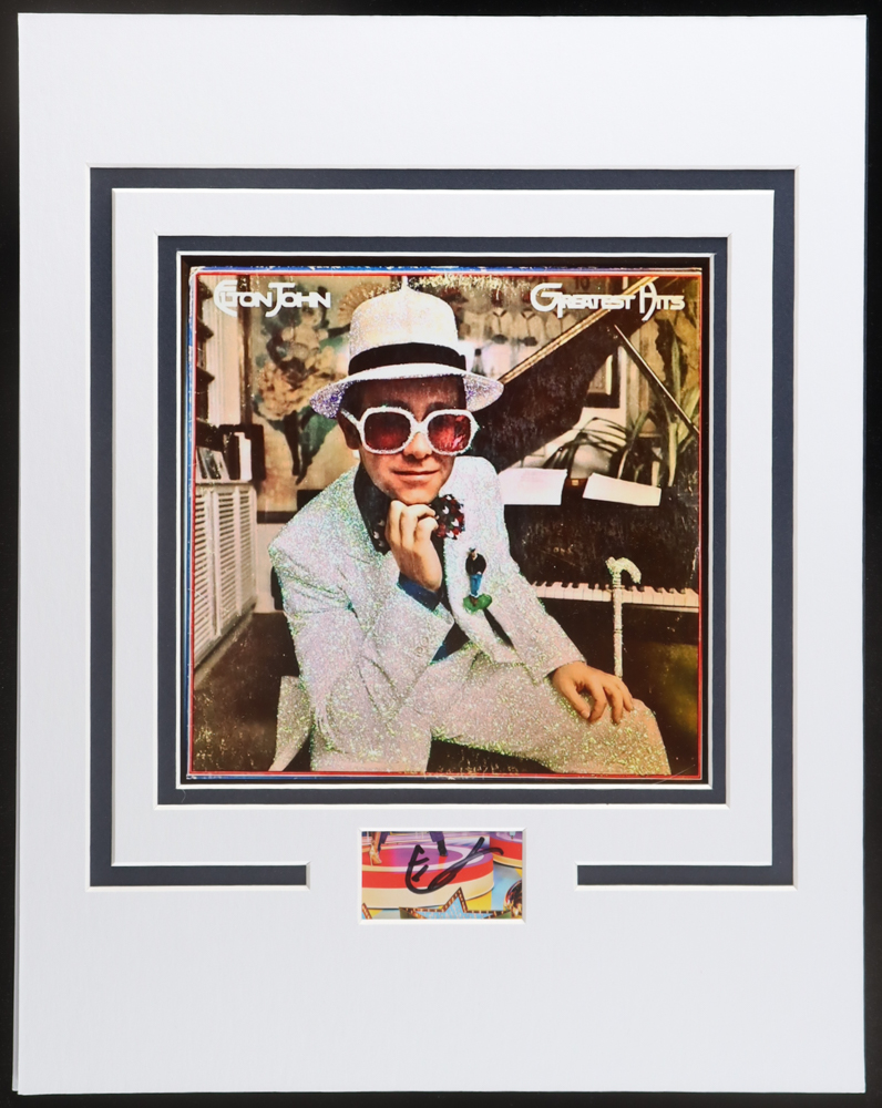 Custom matted display measures approximately 11" x 14" in size. The display features a cut that is hand-signed by Elton John.