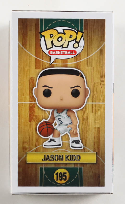 Funko Pop! vinyl figure measures approximately 4" in height and has been hand-signed on the packaging by Jason Kidd (Dallas Mavericks). Please note, the window has been swapped.