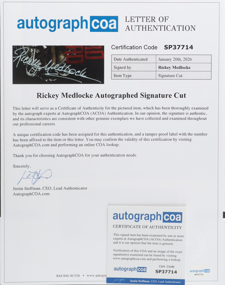 Custom Frame measures approximately 11" x 14" in size and has been hand-signed by Rickey Medlocke.
