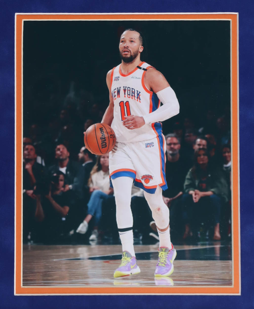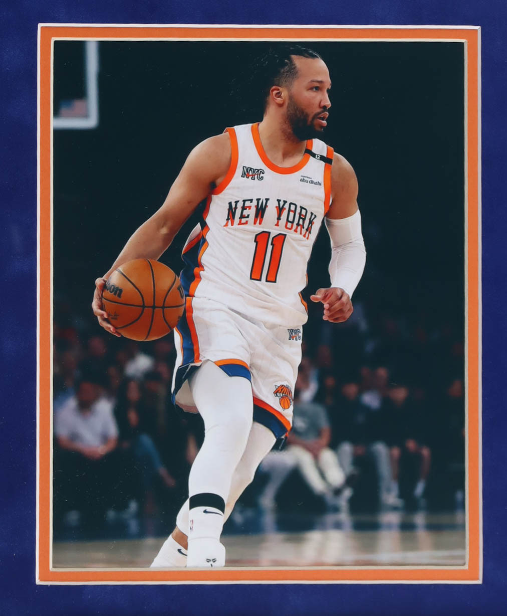 Custom frame measures approximately 32.5" x 39.5" in size and features an authentic jersey that has been hand-signed by Jalen Brunson. Display also includes (2) 8" x 10" photos. Please see photos for more details regarding the condition of the item.