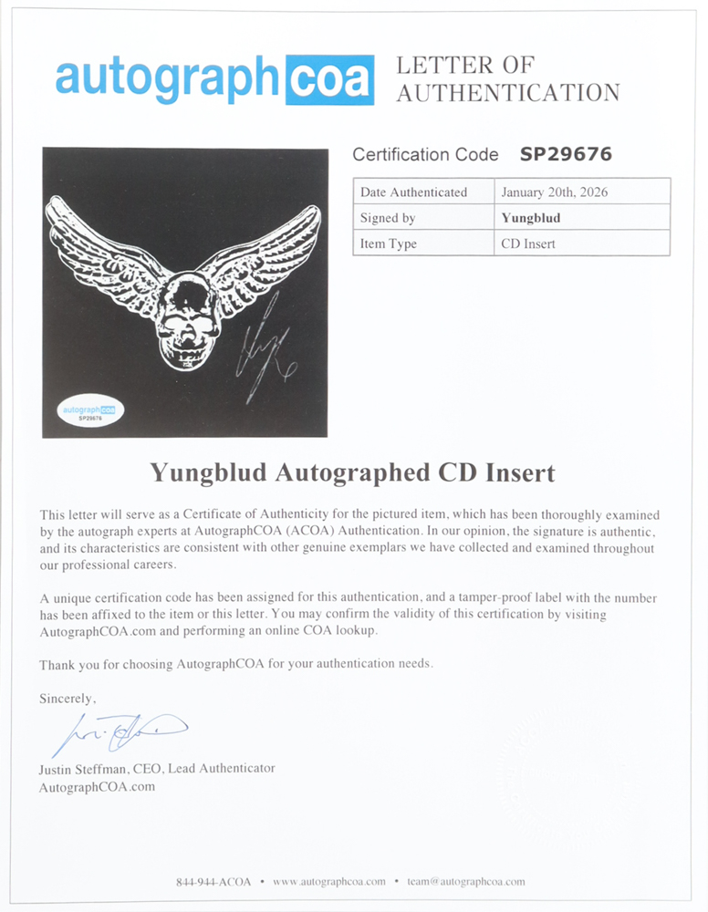 Matted insert display measures approximately 8" x 13.5" in size. Features a CD insert that has been hand-signed by Yungblud. Please note, the CD is included. Refer to photos for more details.