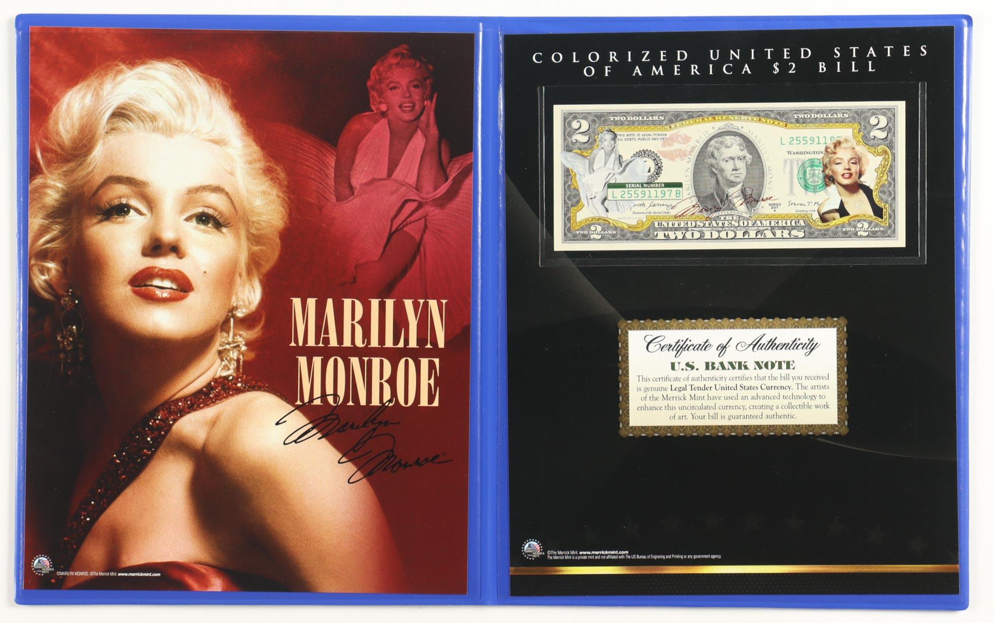 Marilyn Monroe Genuine Legal Tender Colorized U.S. $2 Bill Commemorative Edition Bank Note. Includes folder as shown. Please note, Monroe's autograph is a facsimile.