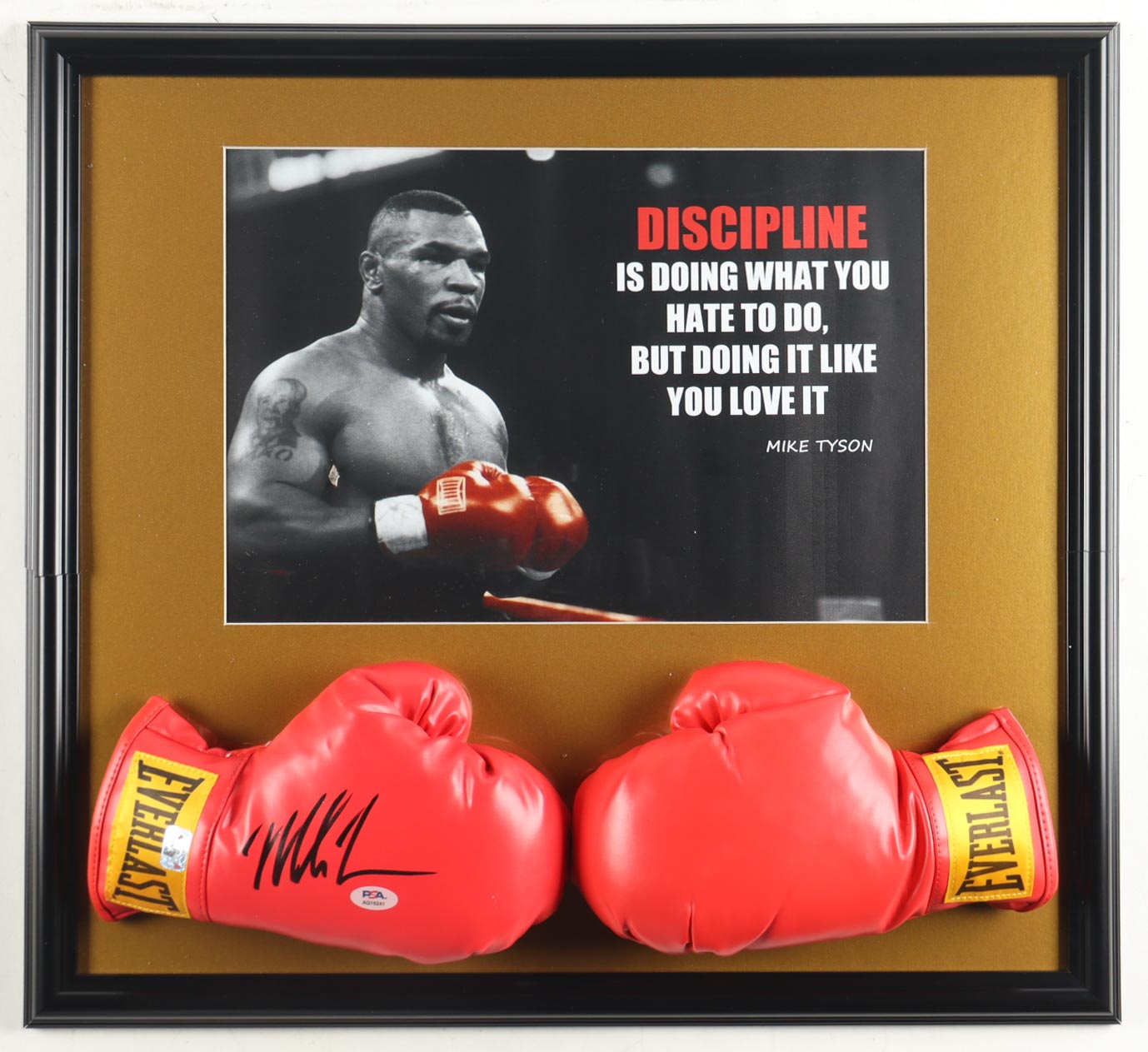 Custom frame measures 22" x 24" in size and features a (2) Everlast boxing gloves that have been hand-signed by Mike Tyson (HOF). Display also features a photo of Mike Tyson. Please see photos for more details regarding the condition of the item.