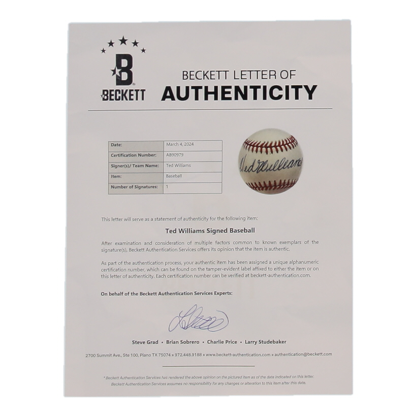 Rawlings Official American League baseball has been hand-signed by Ted Williams (D. 2002, Boston Red Sox, HOF).