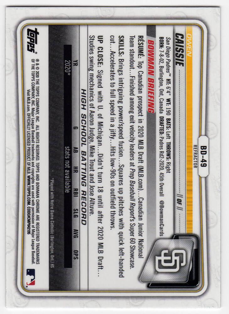 Owen Caissie Signed 2020 Bowman Chrome Draft Refractor #BD-49 RC (Schwartz)