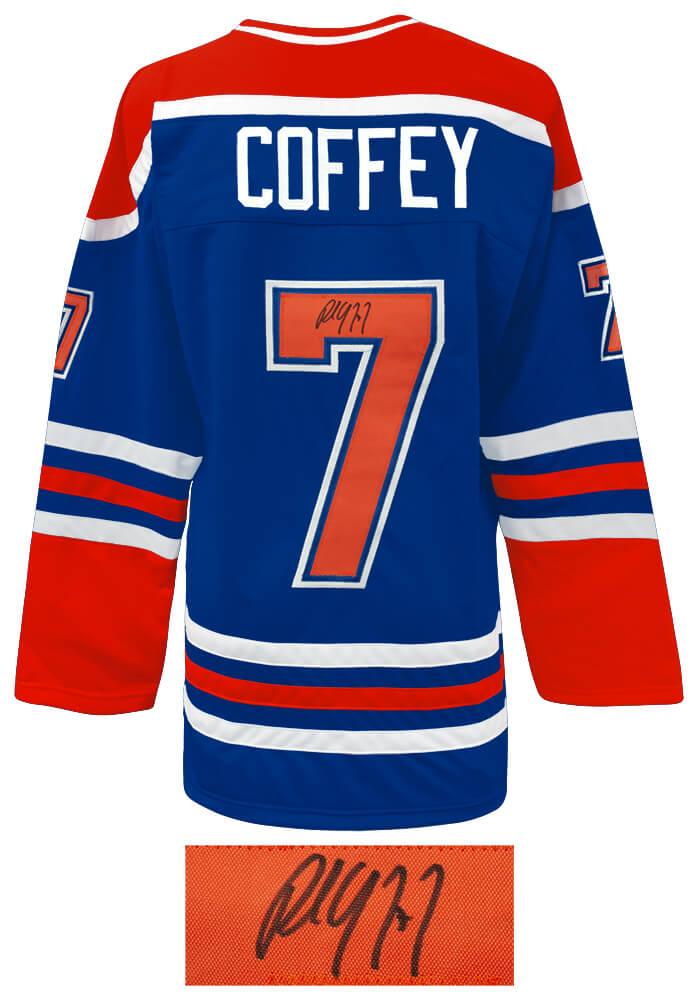 Custom jersey with everything sewn on, size XL. Hand-signed by Paul Coffey (HOF).
