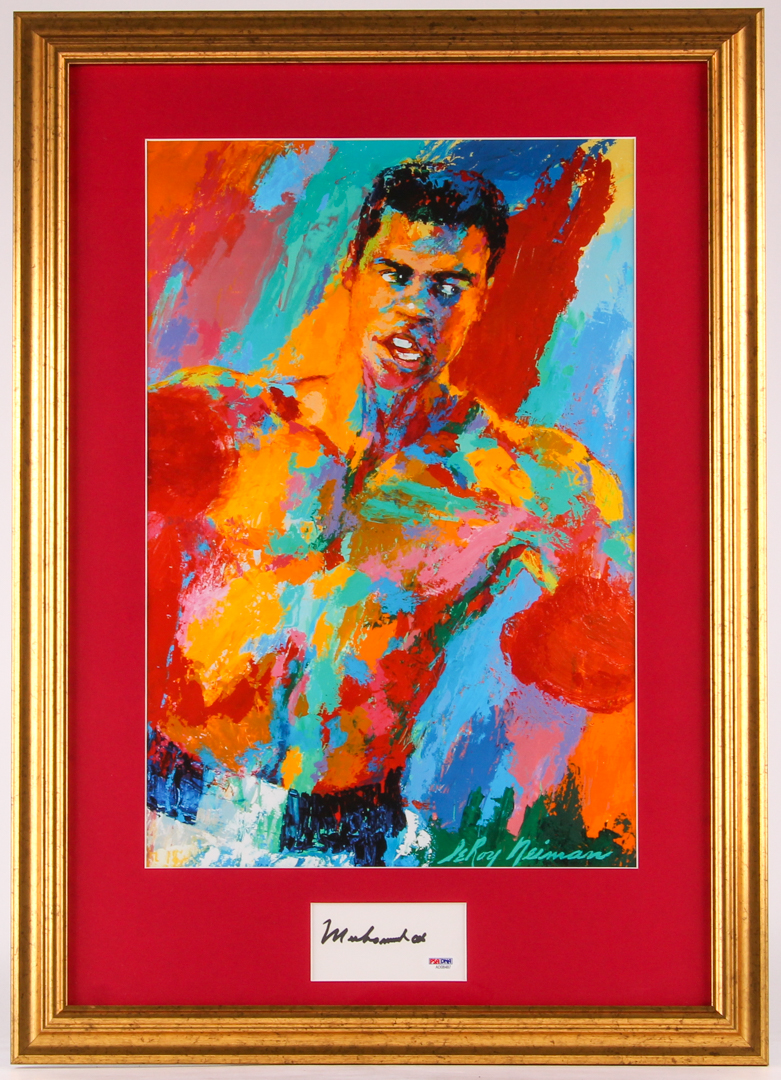 Custom framed display measures 19.17" x 27.75" in size and has been hand-signed in black felt-tip pen by Muhammad Ali (D. 2016, HOF). Display includes a print of Muhammad Ali by artist Leroy Neiman (D. 2012).