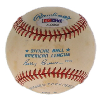 Rawlings Official American League Baseball. Hand-signed by Jim Hunter (D. 1999, New York Yankees, HOF). Please note, the baseball is naturally toning and stained.