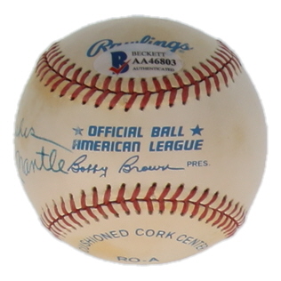 Rawlings Official American League baseball has been hand-signed by Mickey Mantle (D. 1995, New York Yankees, HOF). Please note, the baseball is stained and naturally toned.