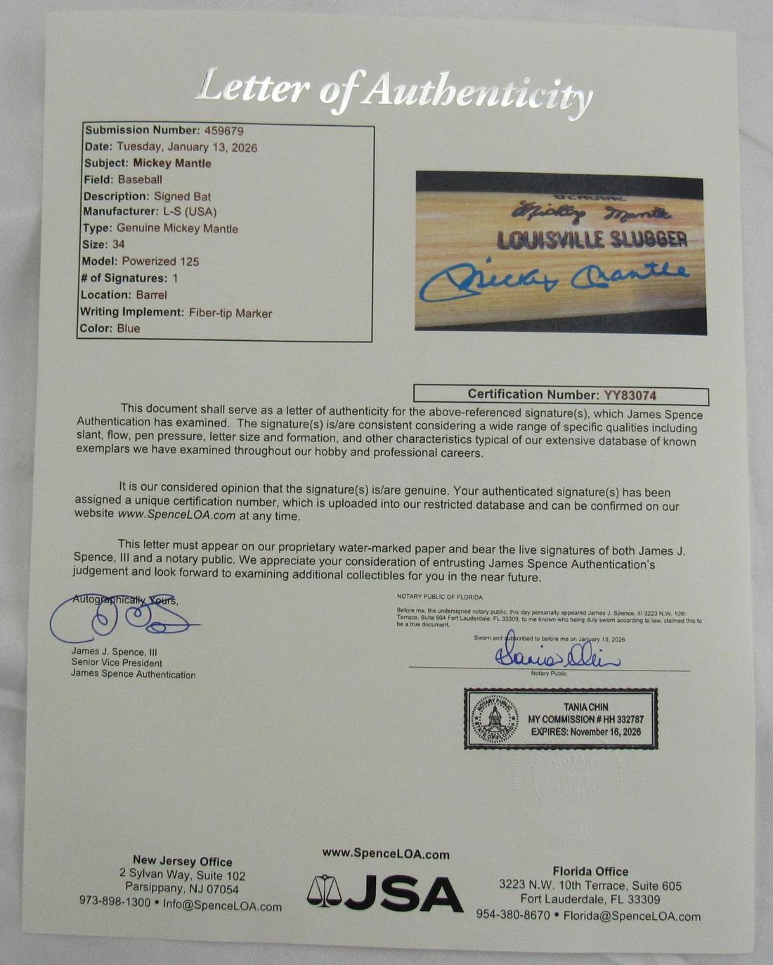 Louisville Slugger baseball bat has been hand-signed by Mickey Mantle (D. 1995, New York Yankees, HOF).