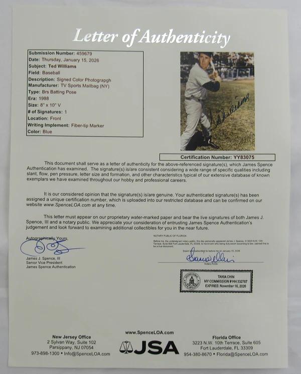 Photo measures 8” x 10” in size and has been hand-signed by Ted Williams (D. 2002, Boston Red Sox, HOF).