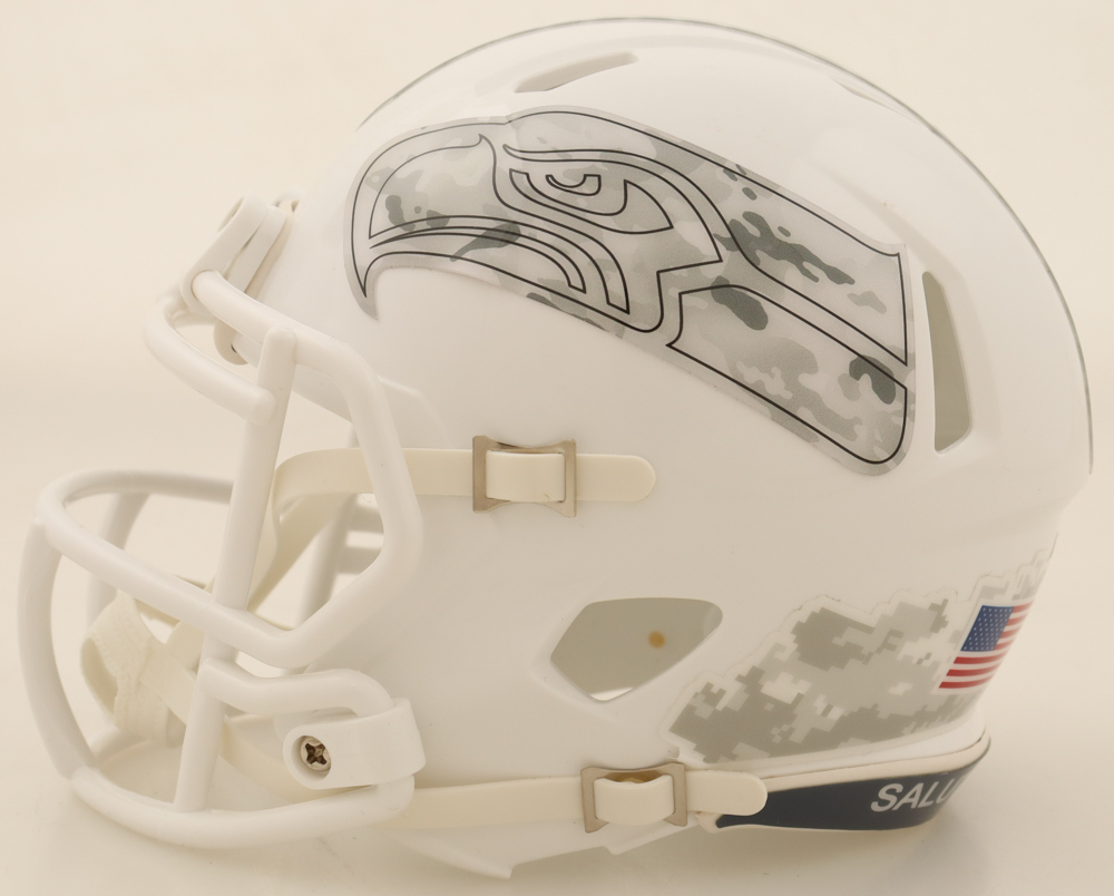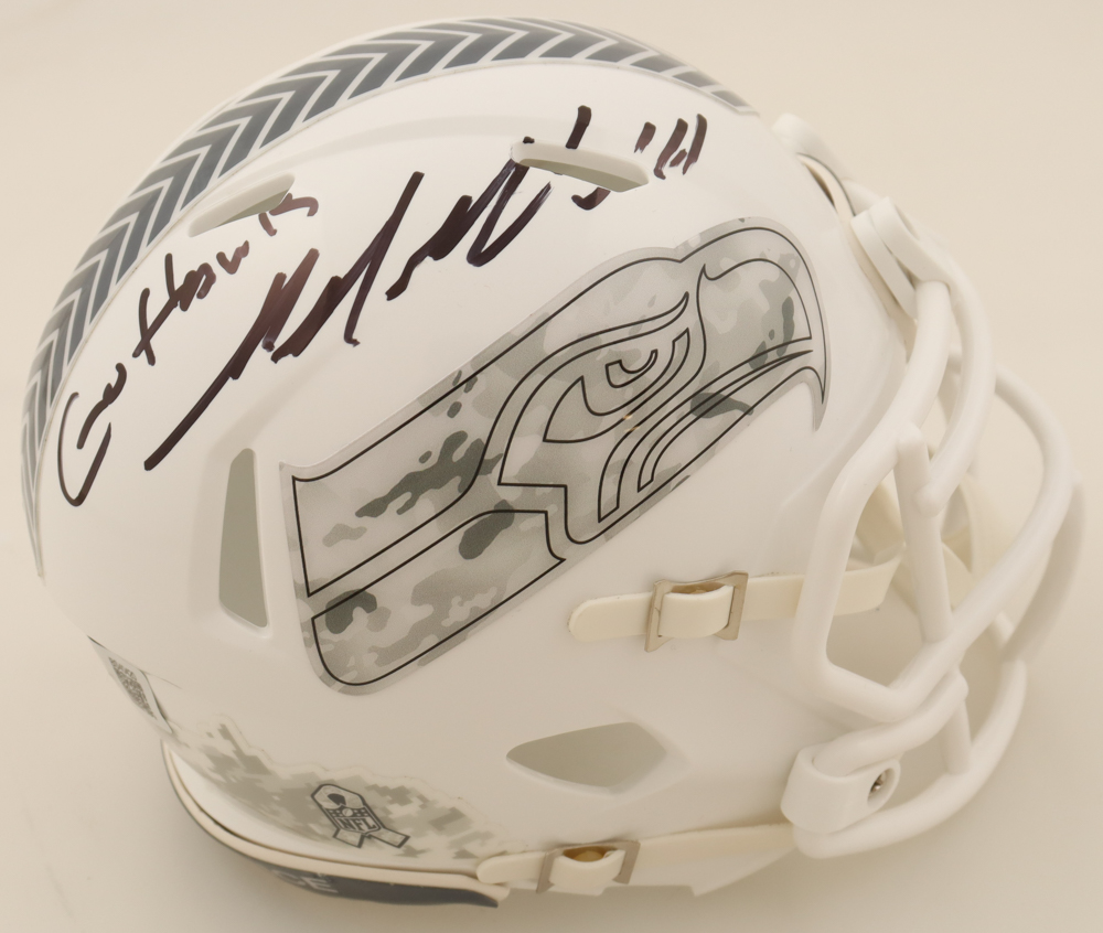 Riddell Seattle Seahawks Salute to Service Alternate Speed Mini Helmet. Hand-signed and inscribed by Mike Macdonald. Please note the signature is cut off, see photos for more details.