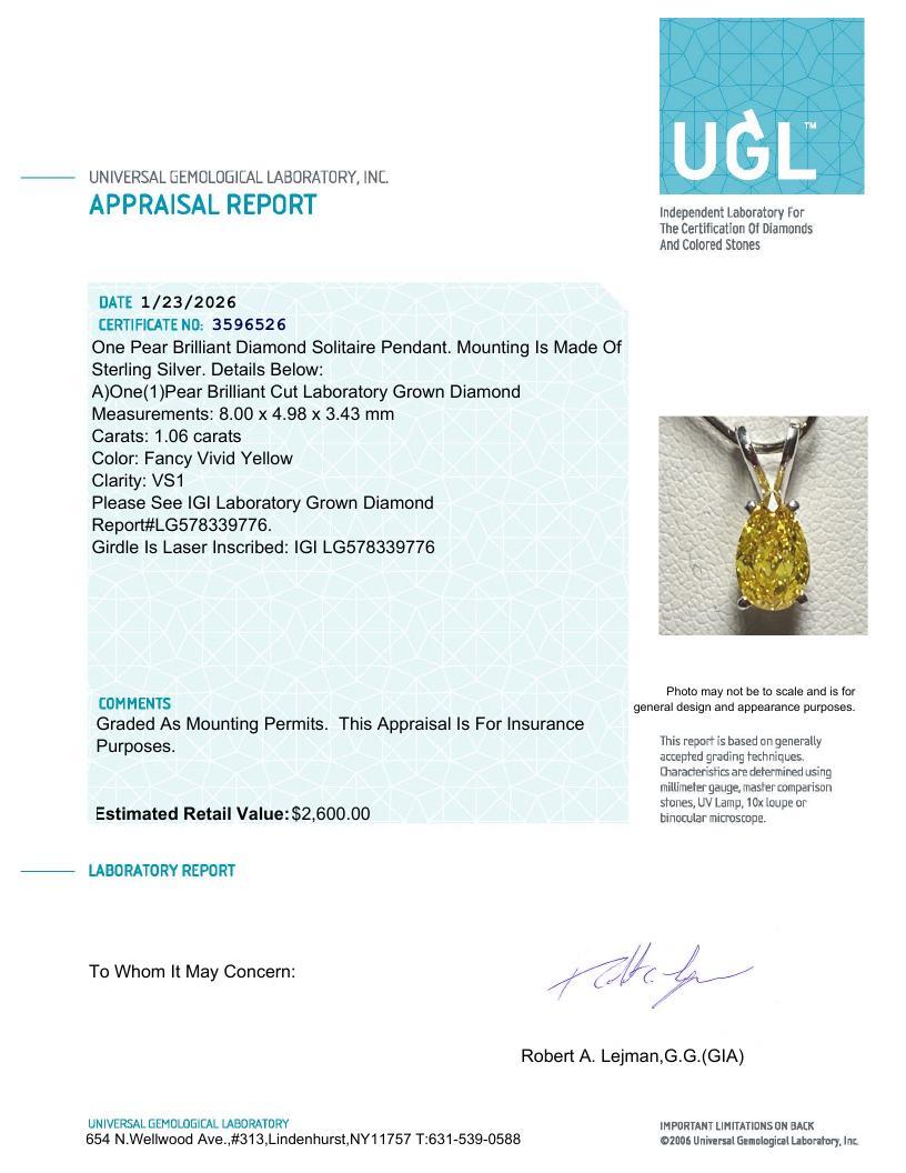 1.06 Carats Lab Grown YELLOW Diamond Pendant VS1 | $2,600 Estimated Retail Value (UGL & IGI Certs) | Brand New