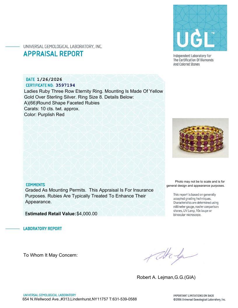 Offered for sale is a new ladies ruby three row eternity ring set in yellow gold over sterling silver. This ring features three continuous rows of round faceted rubies with rich purplish red color, offering substantial finger coverage and a bold, elegant look. A professional UGL appraisal is included for insurance purposes.