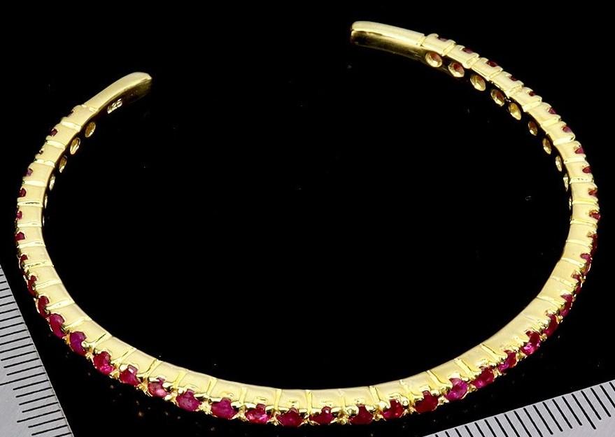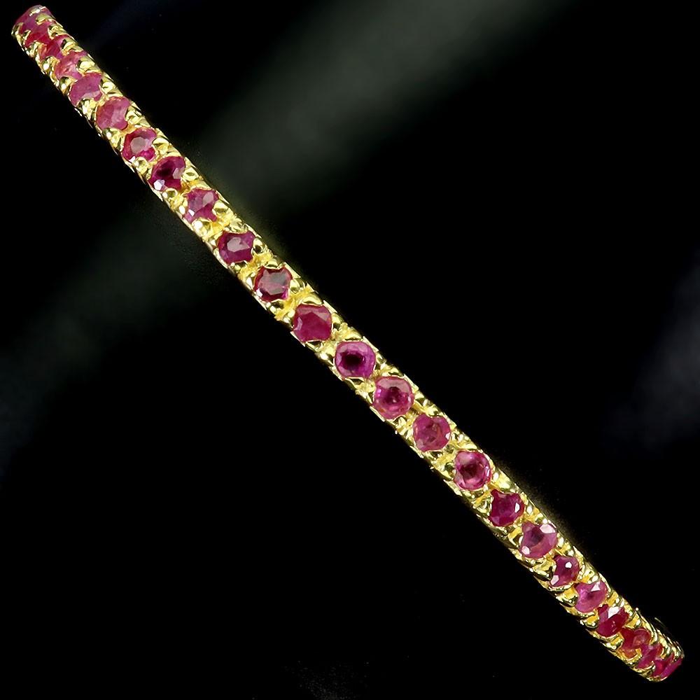 Offered for sale is a new ladies ruby bangle bracelet set in yellow gold over sterling silver. This elegant bangle features a continuous row of round faceted rubies in a purplish red hue, offering a clean, classic look with refined sparkle. The bracelet is a timeless piece suitable for everyday wear or stacking and includes a professional UGL appraisal for insurance purposes.