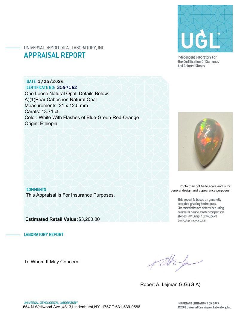 13.71 Carats Natural White Opal Loose | Estimated Retail Value: $3,200 (UGL Cert)