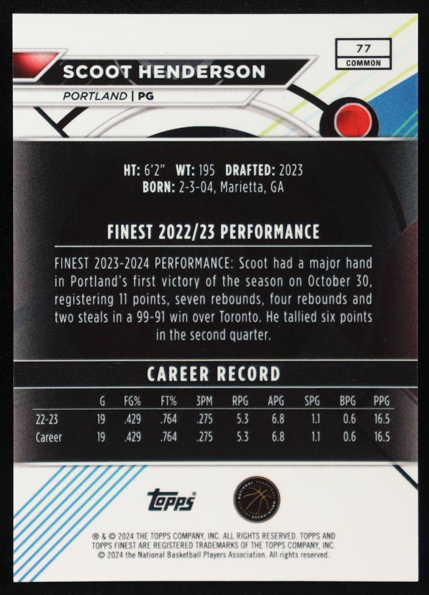 Scoot Henderson 2023-24 Finest Red Black Vapor Refractors #77 #5/10 RC