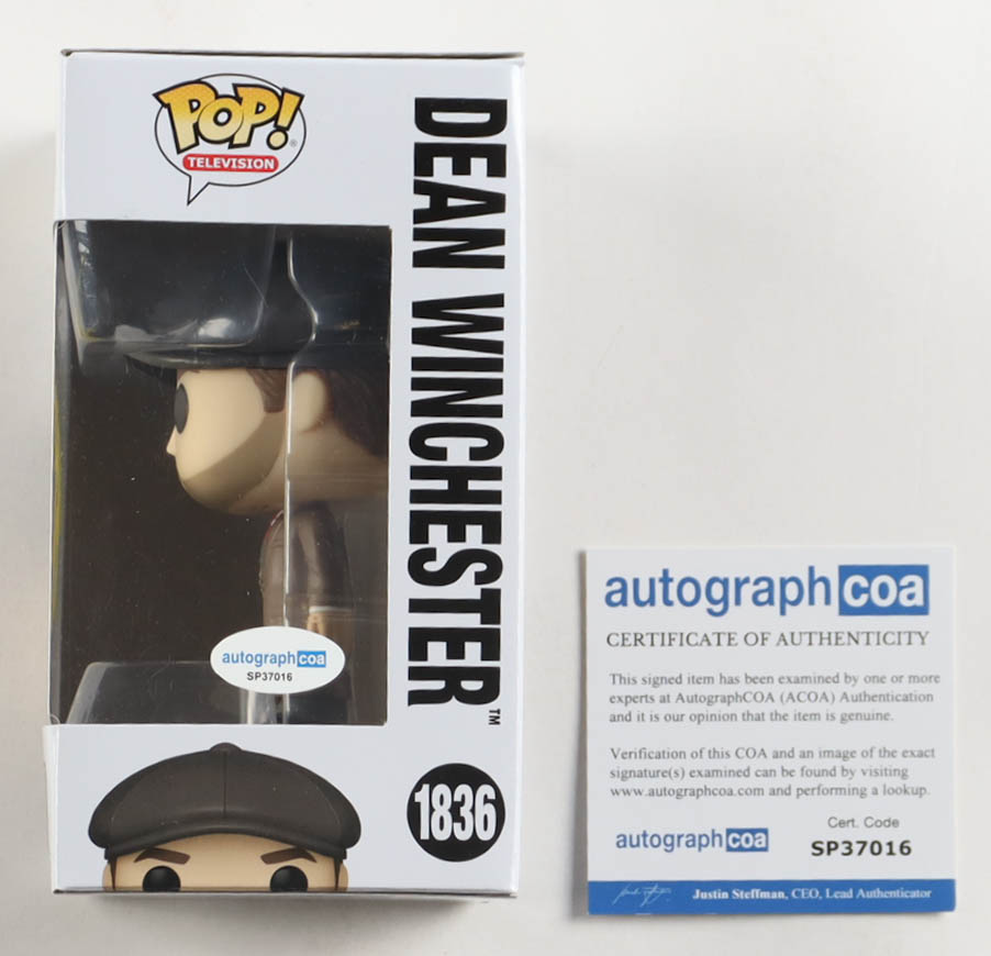 Funko Pop! vinyl figure measures approximately 4" in height and has been hand-signed on the packaging by Jensen Ackles. Please note, the window has been swapped.