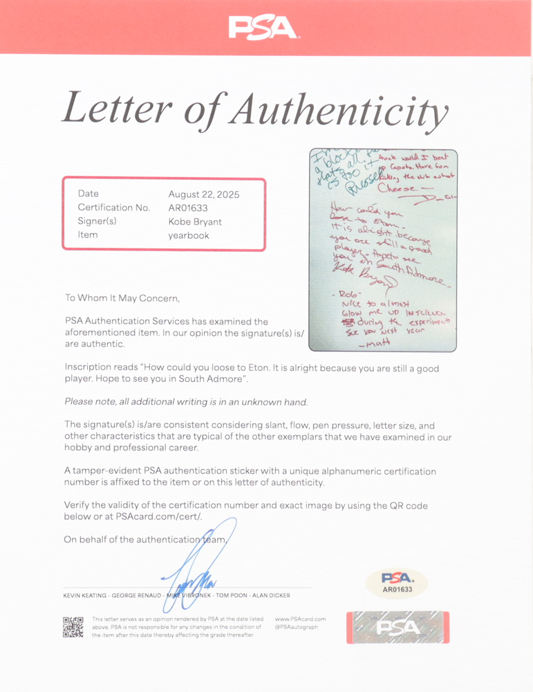 Kobe Bryant Signed 1992 Middle School Yearbook With Personalized Note (PSA)
