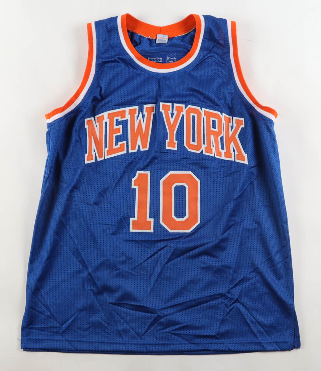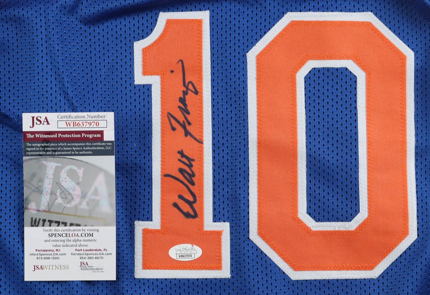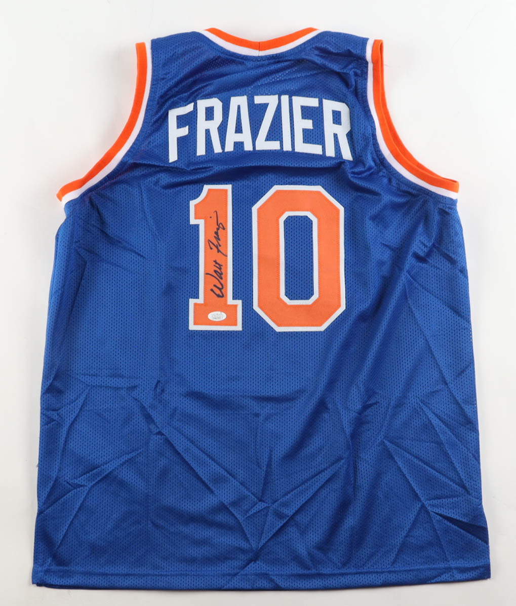 Custom jersey with everything sewn on, size XL. Hand-signed by Walt Frazier (HOF).