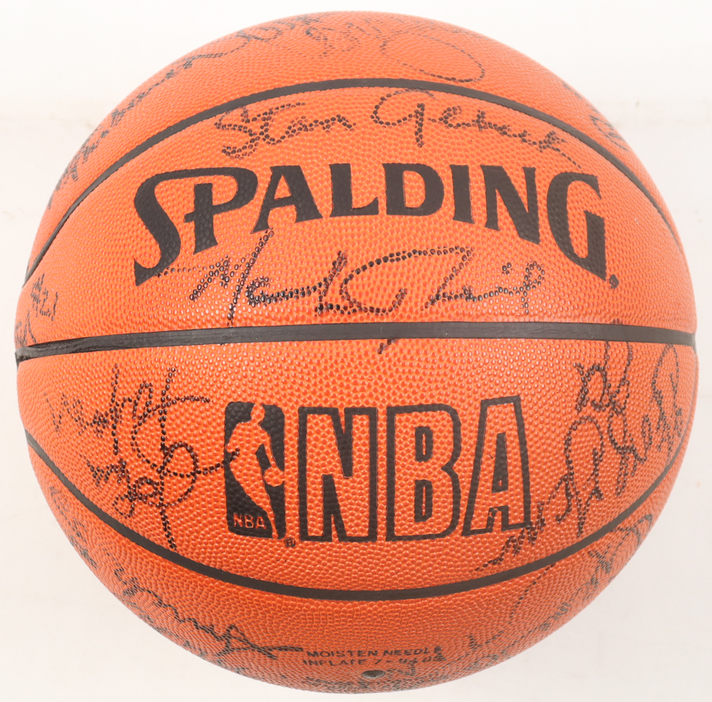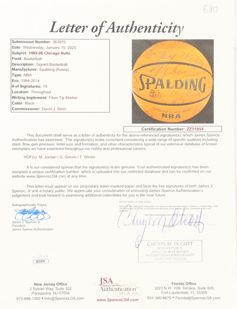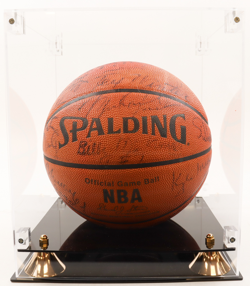 Spalding official NBA game basketball has been hand-signed by (19) members of the 1985-86 Chicago Bulls team including basketball legend, Michael Jordan! Display case is included as shown. Jordan signature is above official game ball side above the Spalding logo.