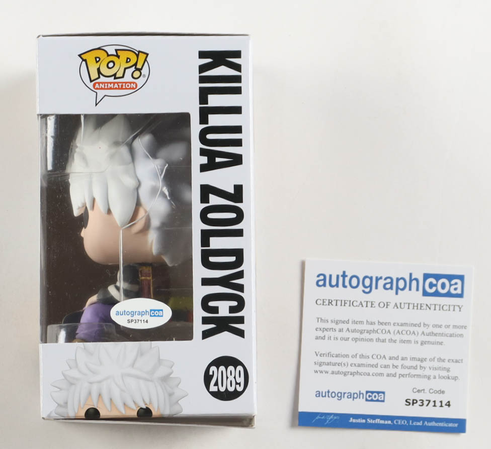 Funko Pop! vinyl figure measures approximately 4" in height and has been hand-signed on the packaging by Cristina Vee (Killua Zoldyck Voice Actor). Please note, the window has been swapped.