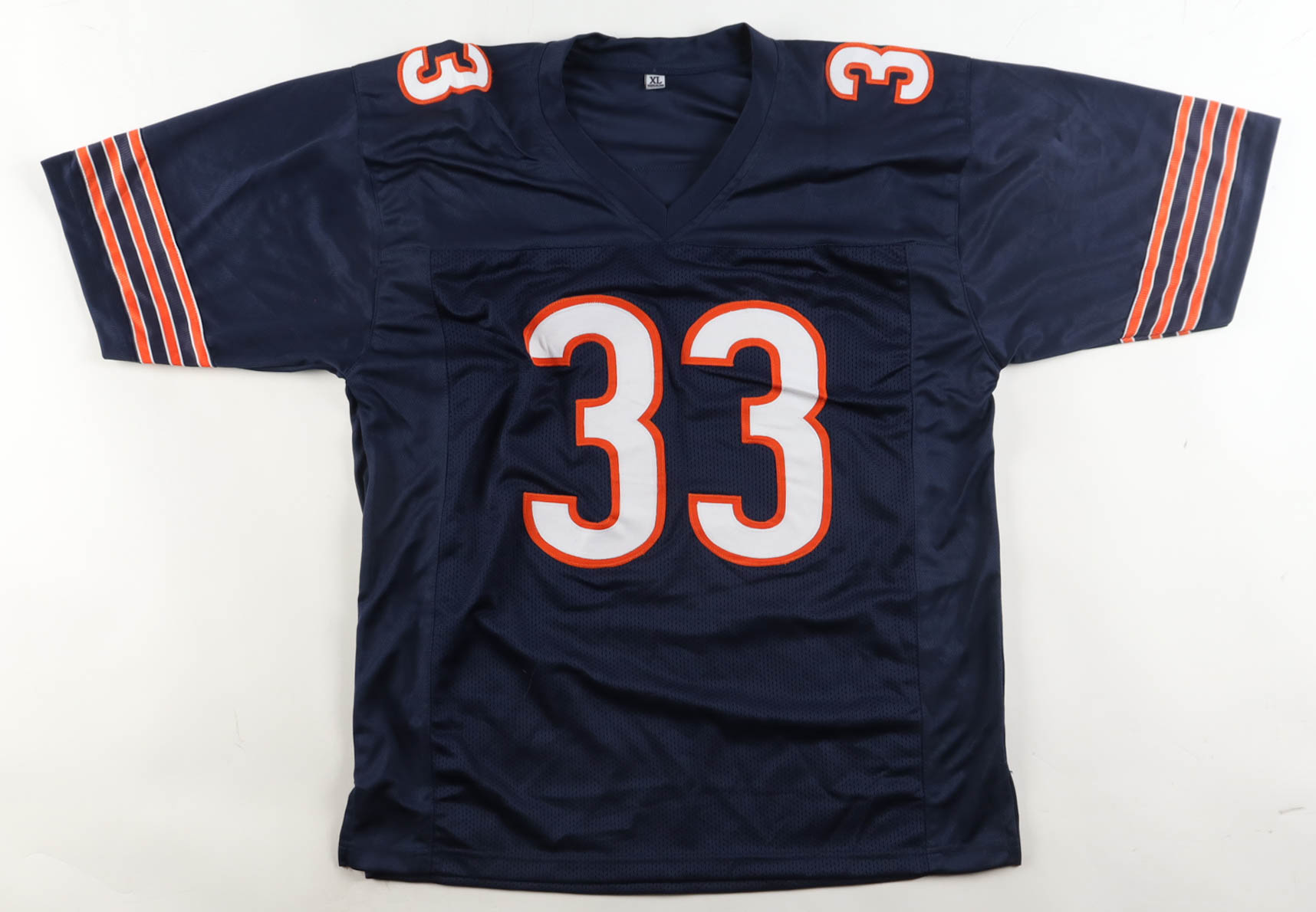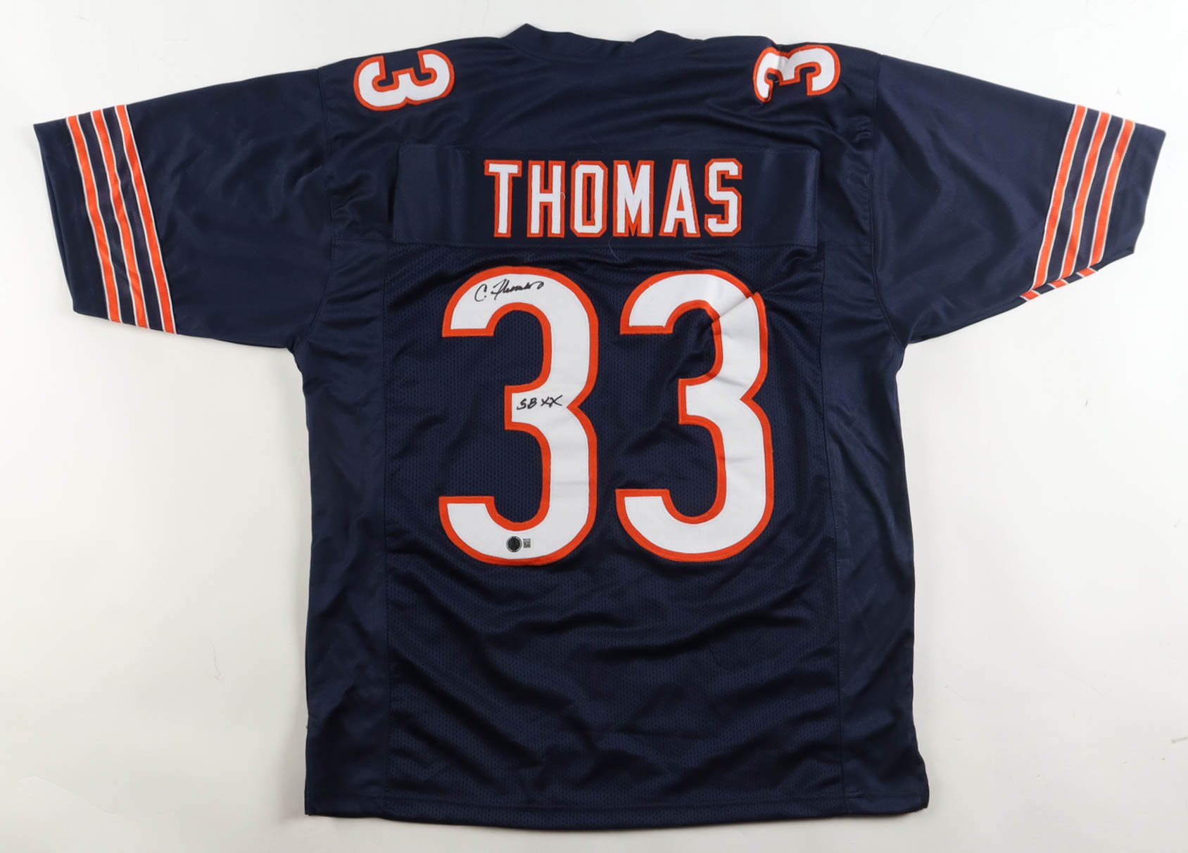 Custom jersey with everything sewn on, size XL. Hand-signed and inscribed by Calvin Thomas. Please note, the signature has bled.