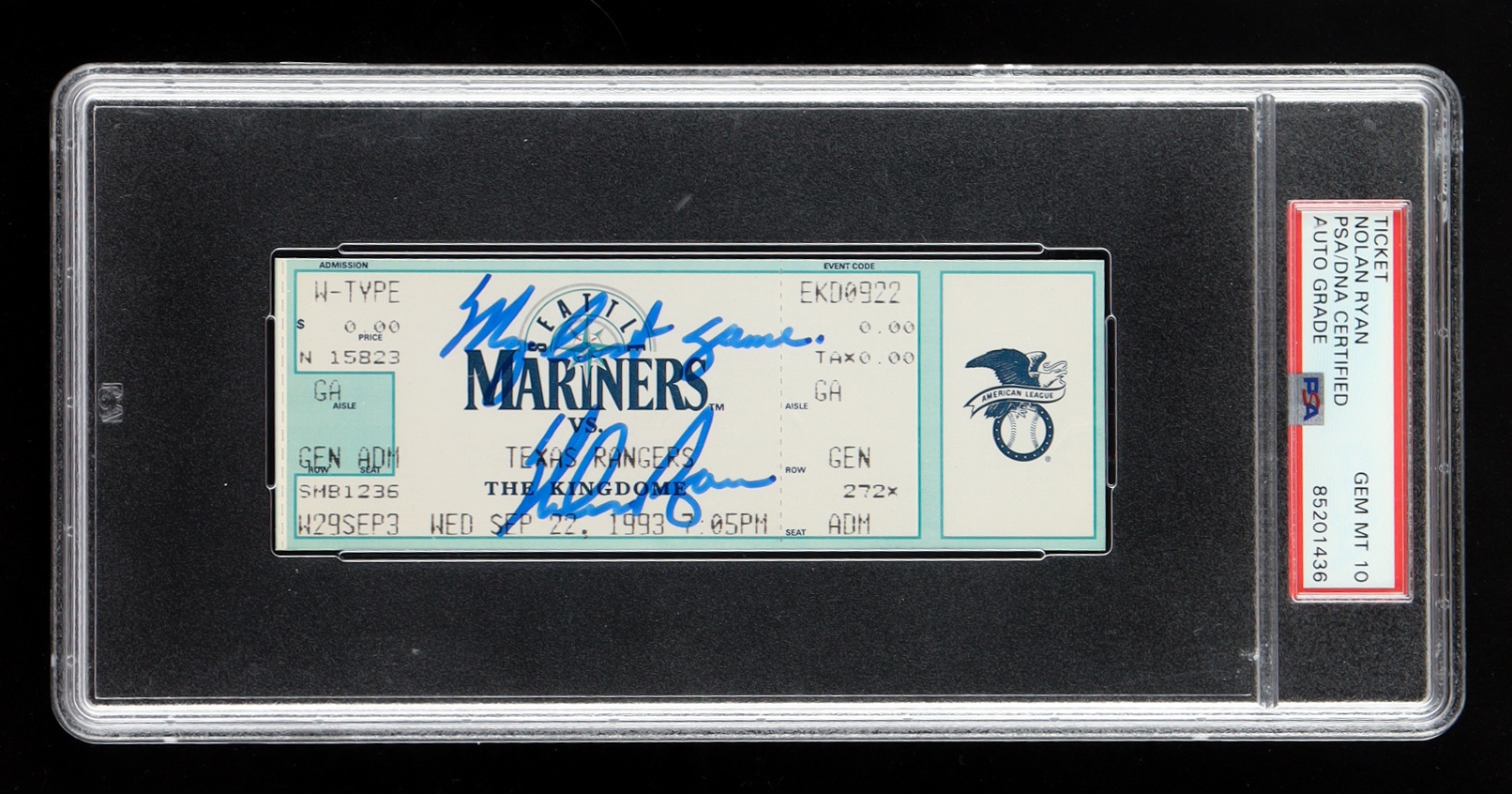 1993 Original Game ticket has been hand-signed by Nolan Ryan (Texas Rangers, HOF) and graded (PSA 10). Please see photos for details regarding the item.