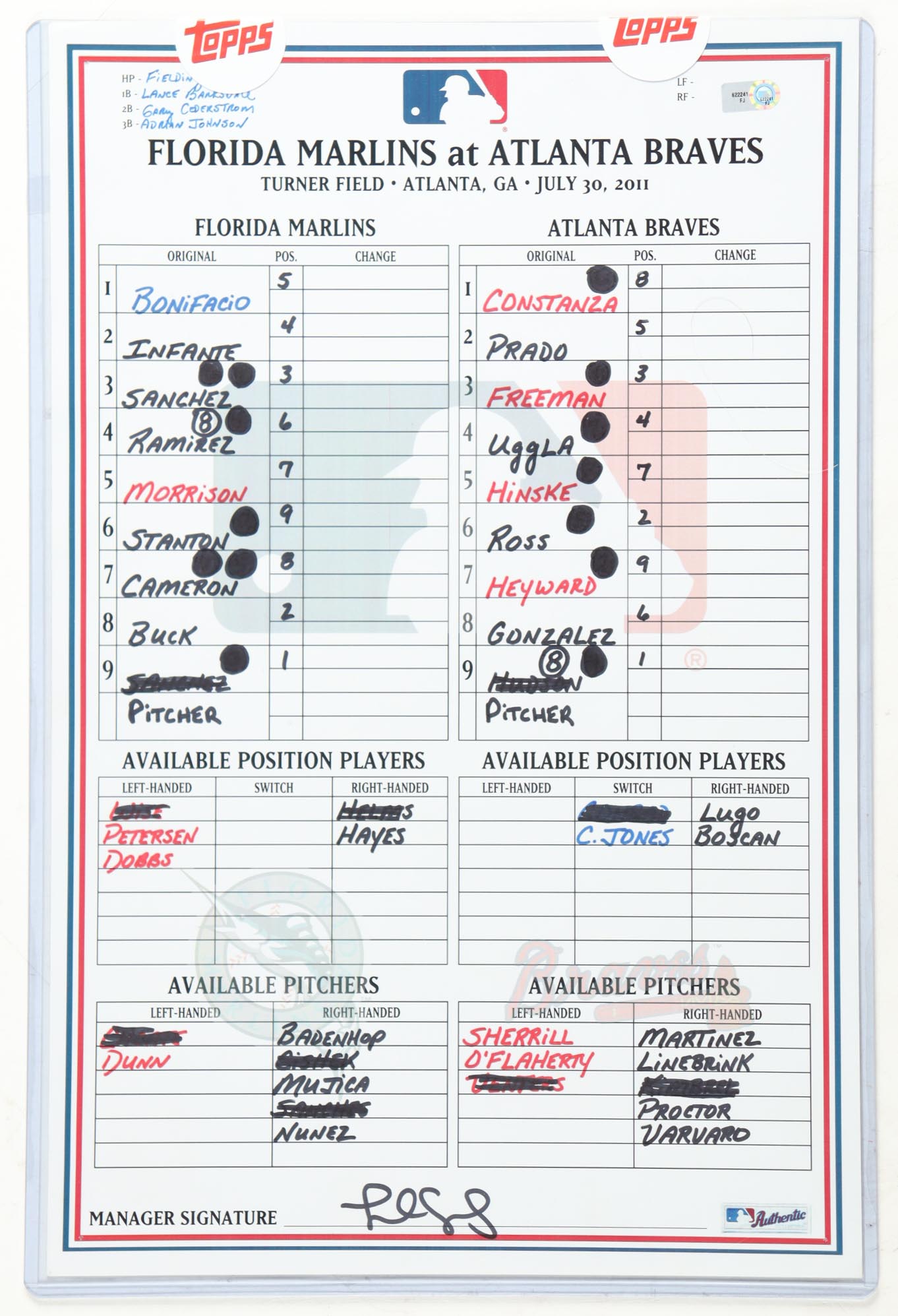 July 30, 2011 Atlanta Braves vs. Miami Marlins official game-used lineup card. Please see photos for details regarding the condition of the item.