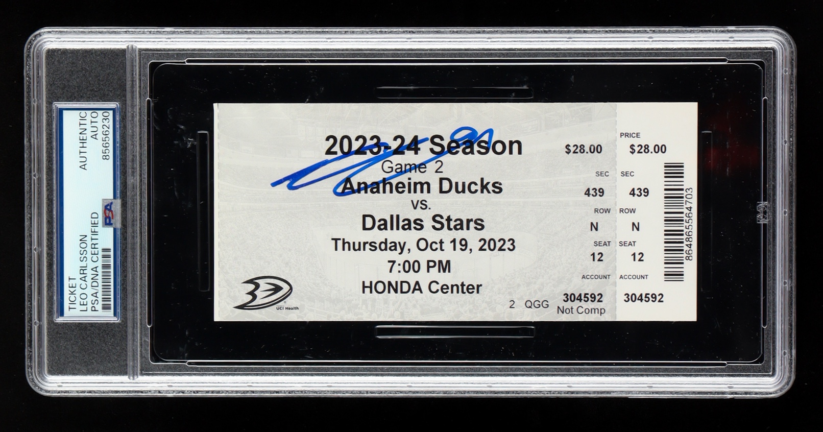 Leo Carlsson Signed 2023 Ducks vs Stars Game Ticket (PSA)