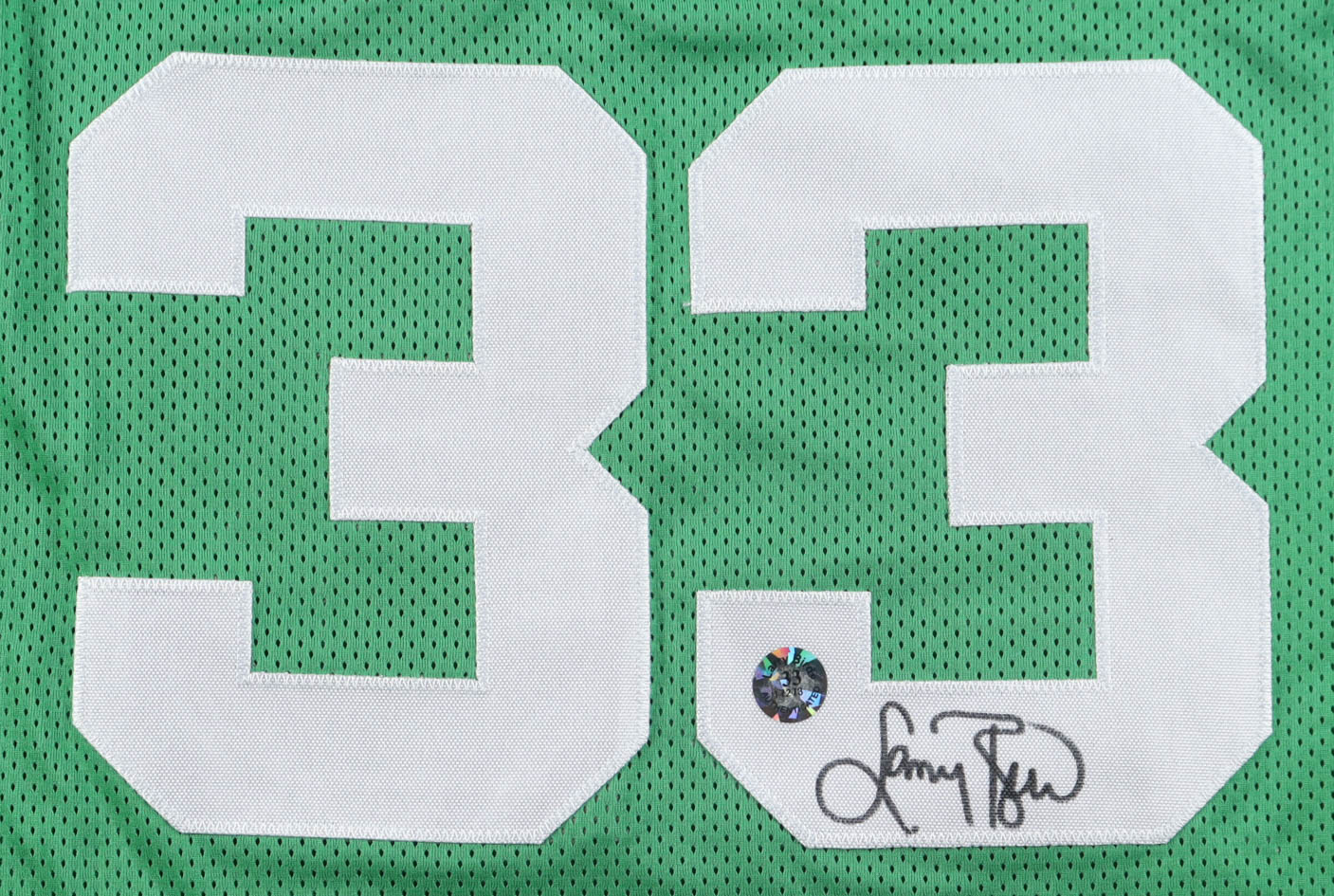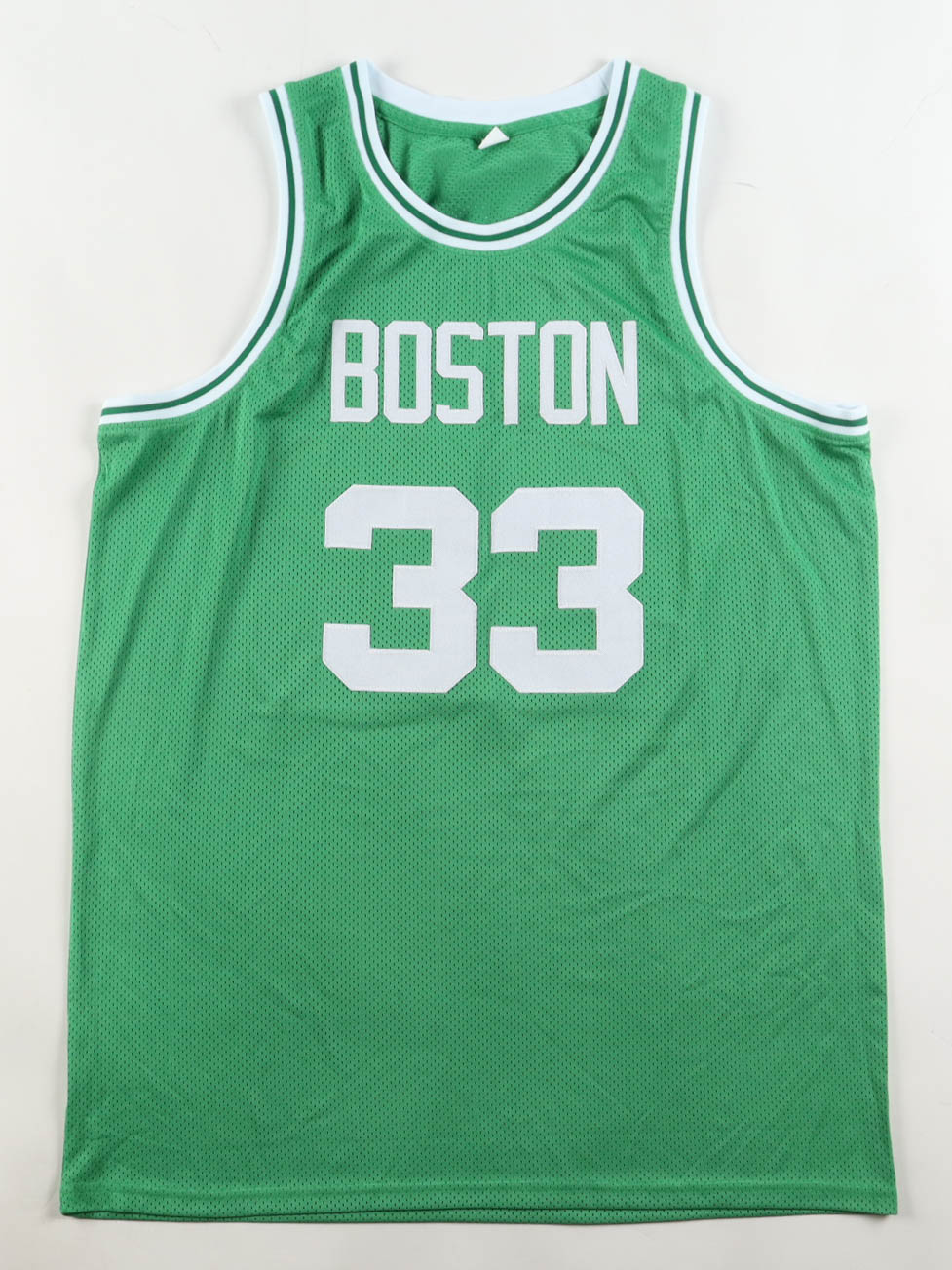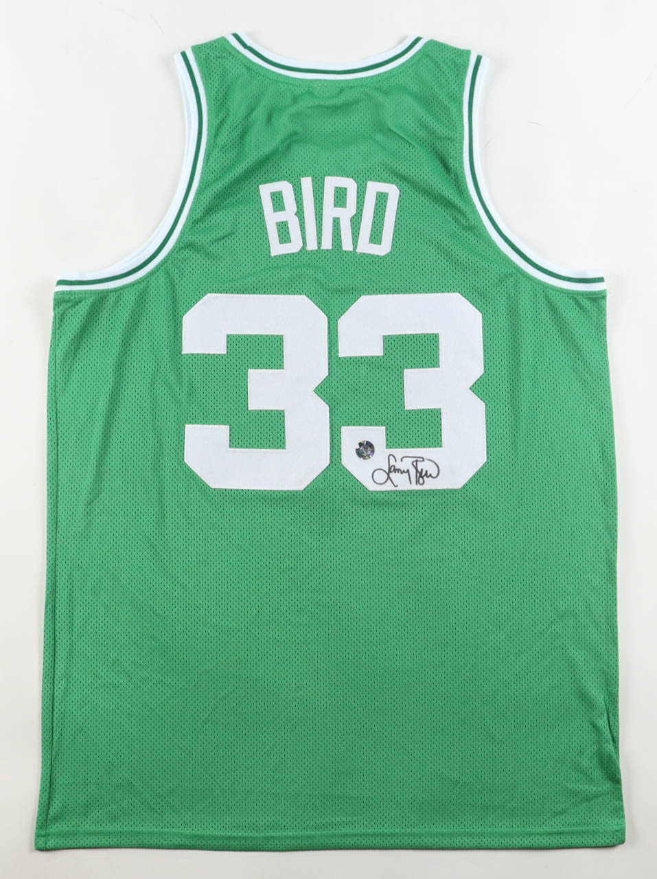 Custom jersey with everything sewn on, size XL. Hand-signed by Larry Bird (HOF).