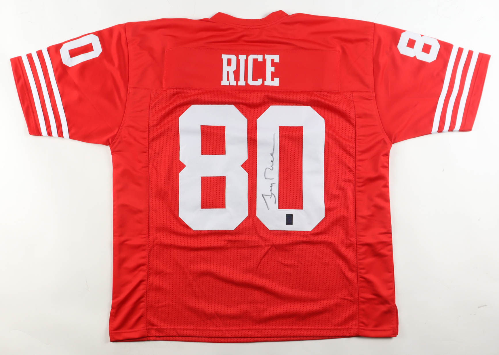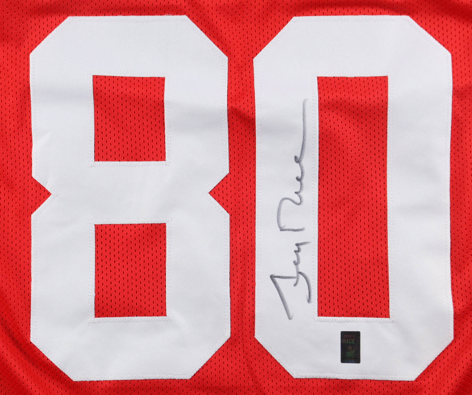 Custom jersey with everything sewn on, size XL. Hand-signed by Jerry Rice (HOF).