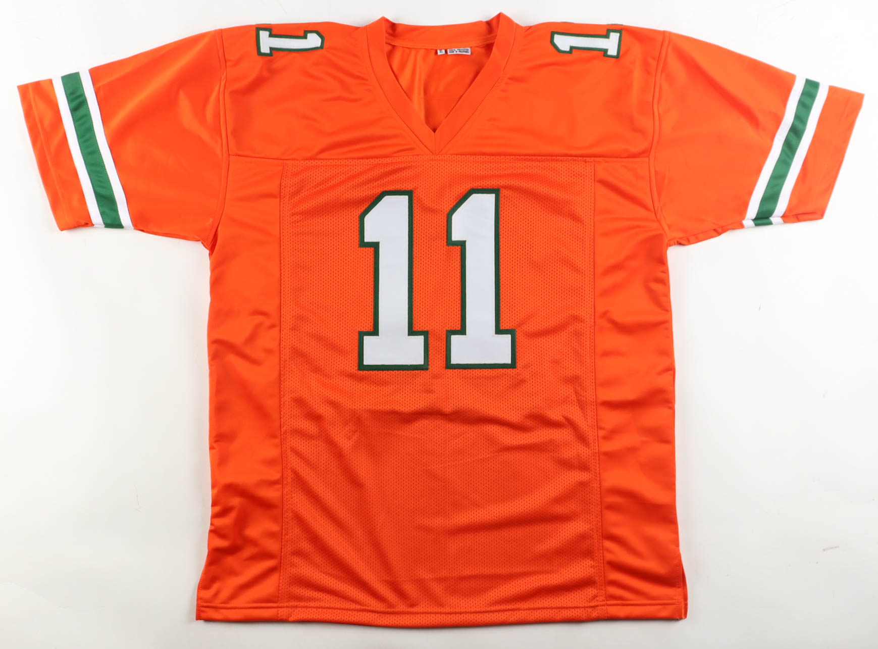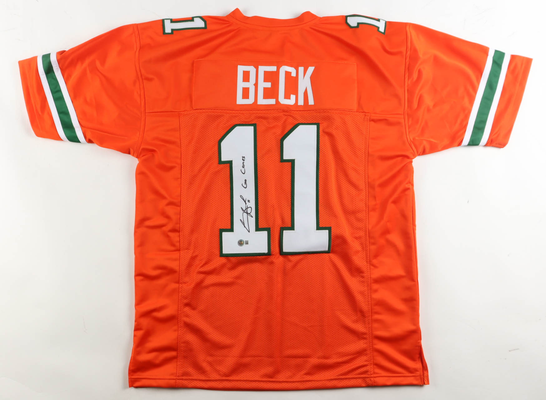 Custom jersey with everything sewn on, size XL. Hand-signed and inscribed by Carson Beck (Miami Hurricanes).