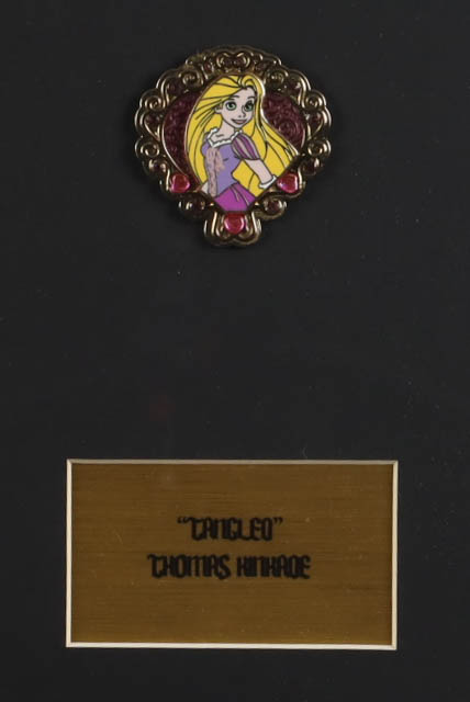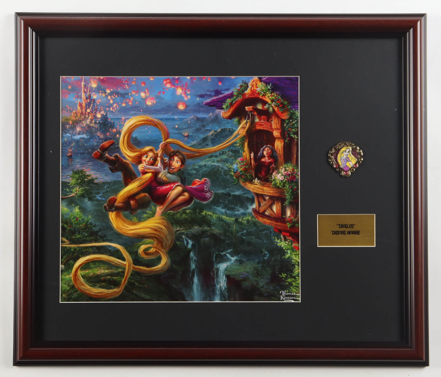 Custom frame measures approximately 16" x 18" in size. The display features an unsigned Thomas Kinkade (D. 2012) art print and also includes a Rapunzel character pin.