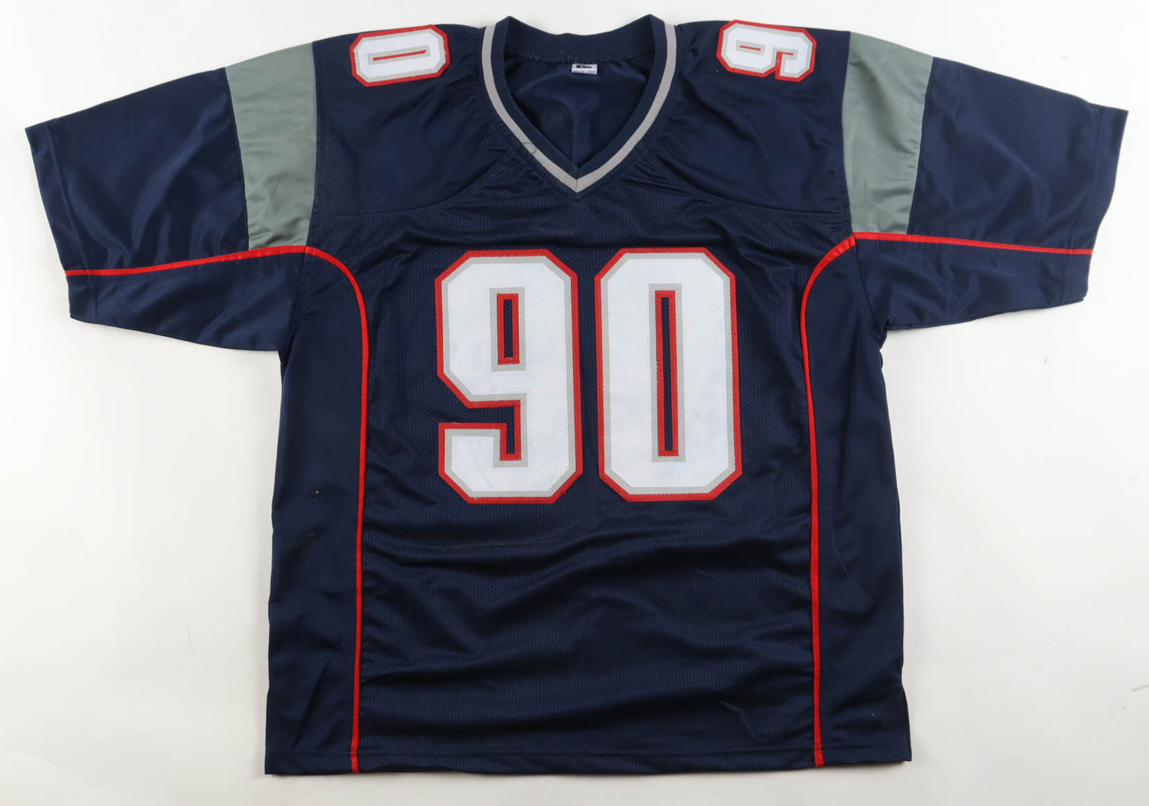 Custom jersey with everything sewn on, size XL. Hand-signed and inscribed by Chad Eaton. Please note, glue is visible through the jersey numbers and the inscription has bled.