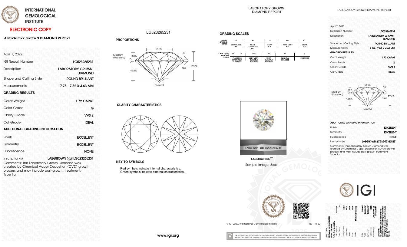 1.72 Carats Lab Grown Diamond Ring G, VVS2 | $3,100 Estimated Retail Value (UGL & IGI Certs) | Brand New