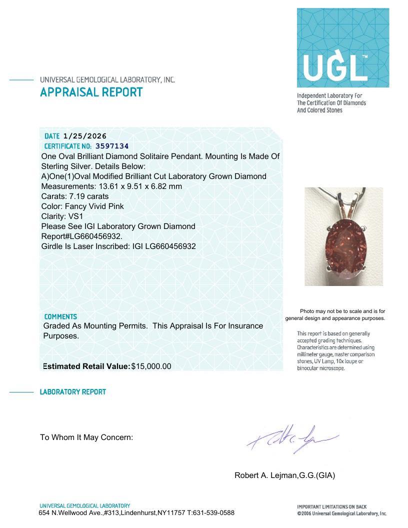 7.19 Carats Lab Grown Fancy Vivid Pink Diamond Pendant VS1 | $15,000 Estimated Retail Value (UGL & IGI Certs) | Brand New