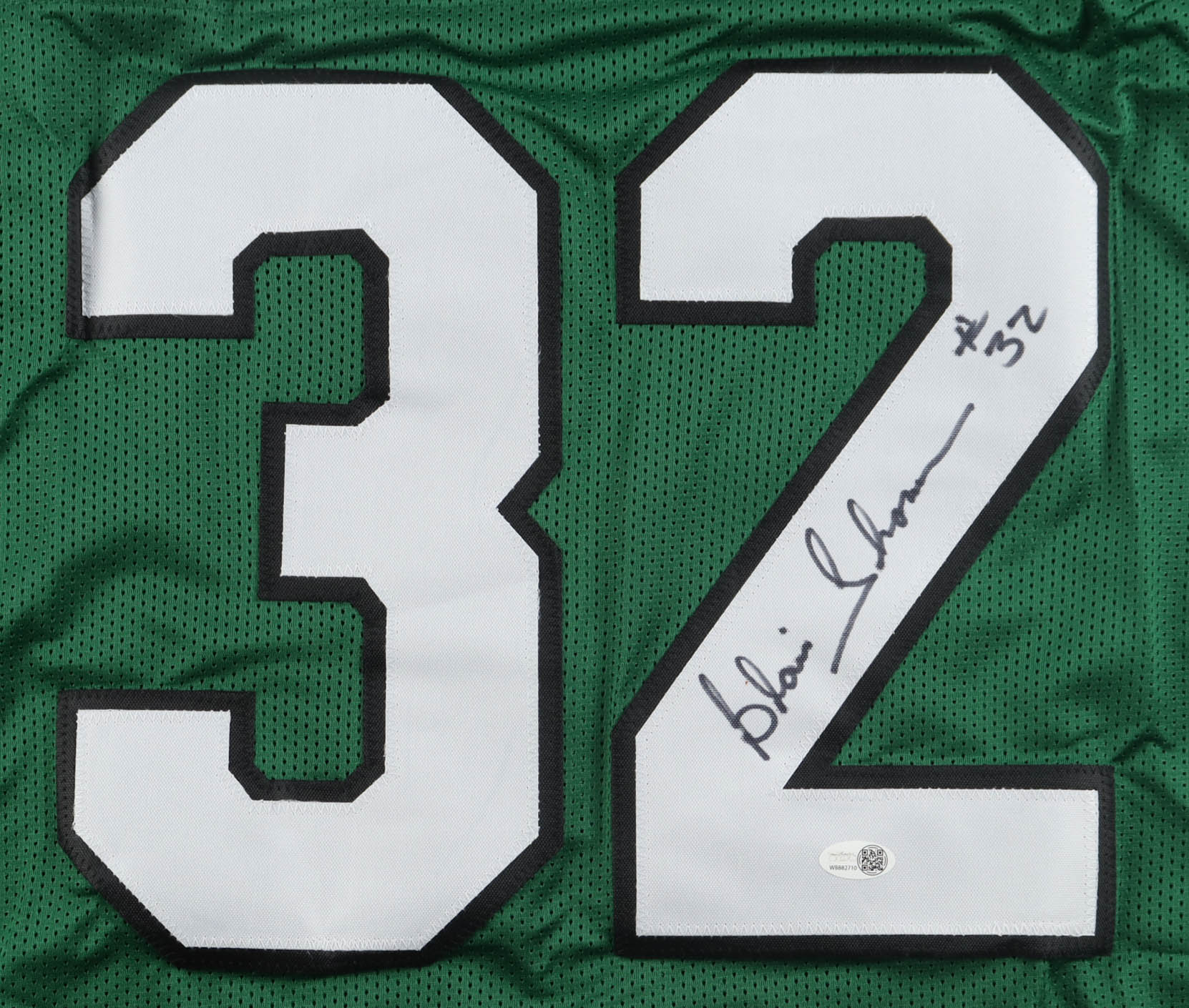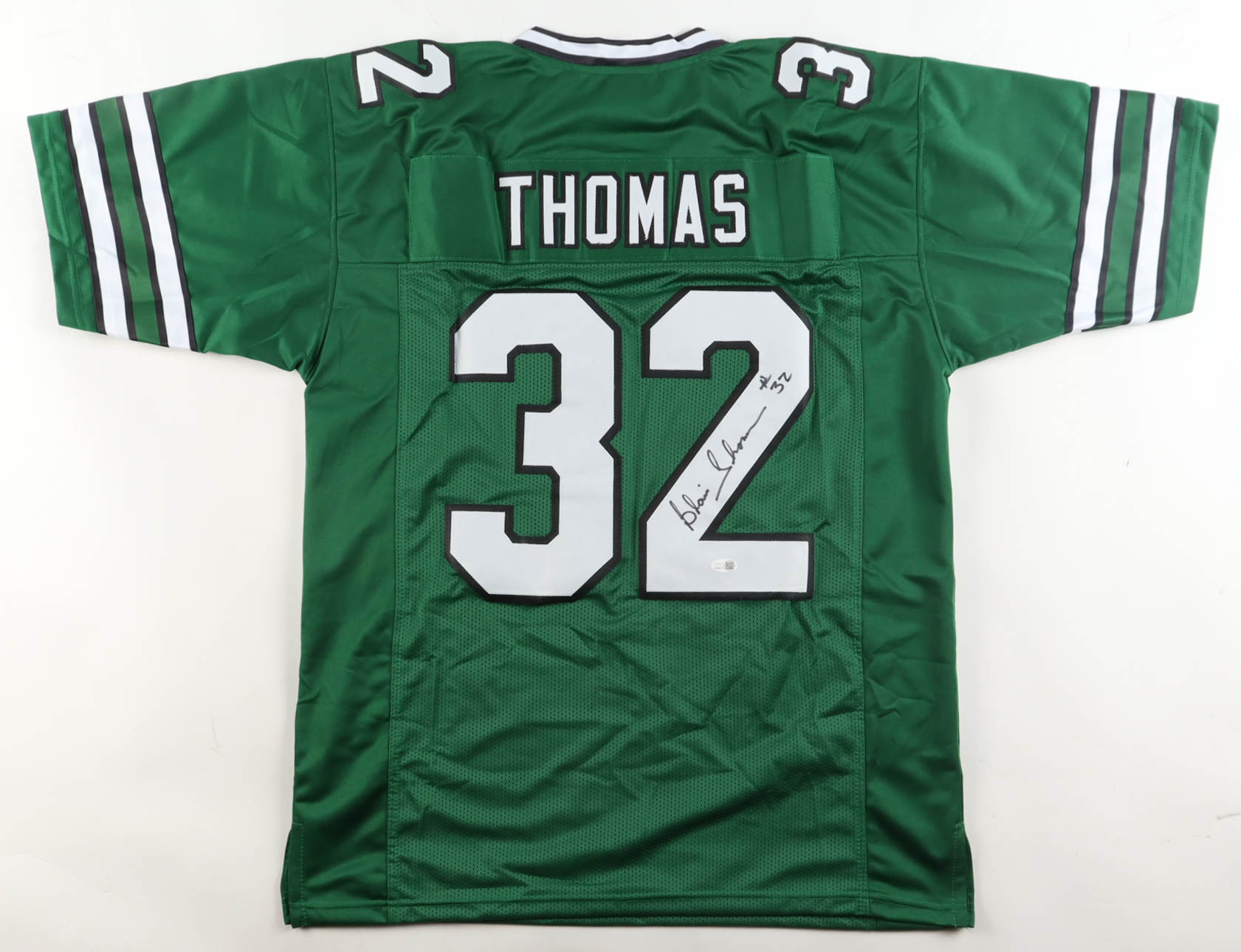 Custom jersey. Everything sewn on, size XL. Hand-signed by Blair Thomas. Please note, glue is visible through the reverse number.