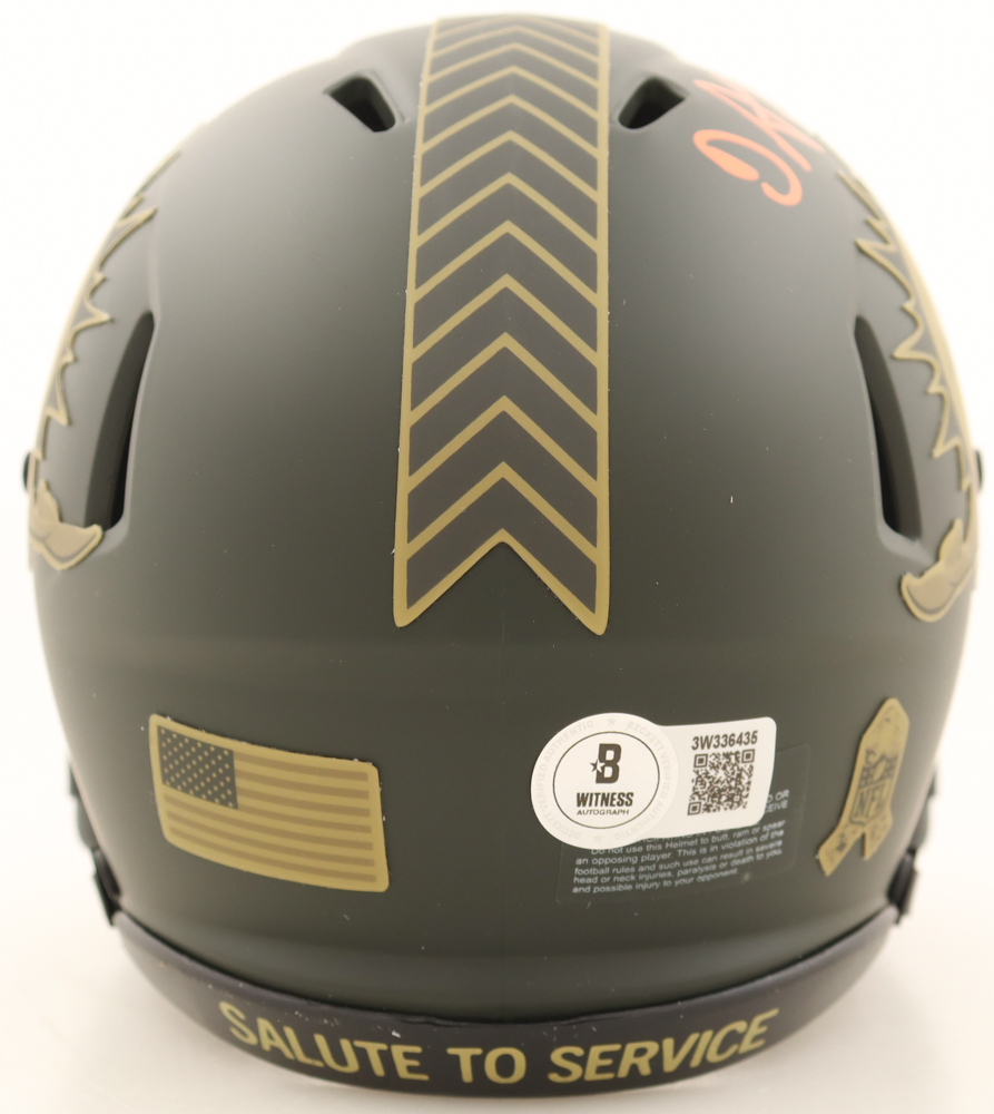 Riddell Miami Dolphins Salute To Service Alternate speed mini helmet. Hand-signed by De’Von Achane.