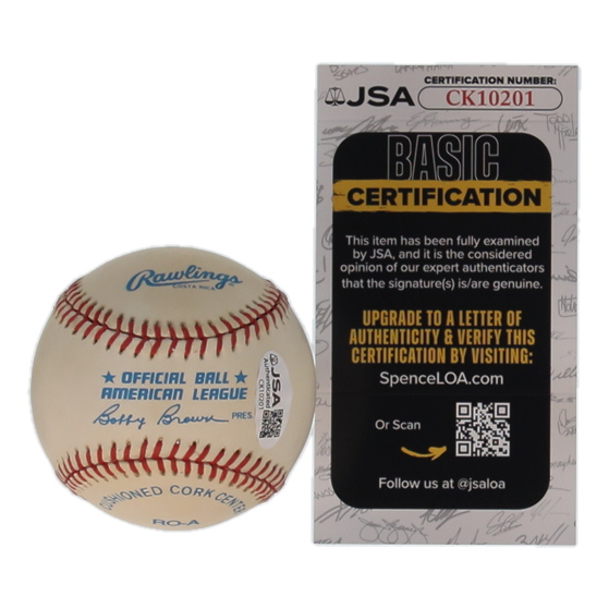 Rawlings Official American League Baseball. Hand-signed by Brooks Robinson (D. 2023, Baltimore Orioles, HOF). Please note, the baseball is naturally toning and stained.