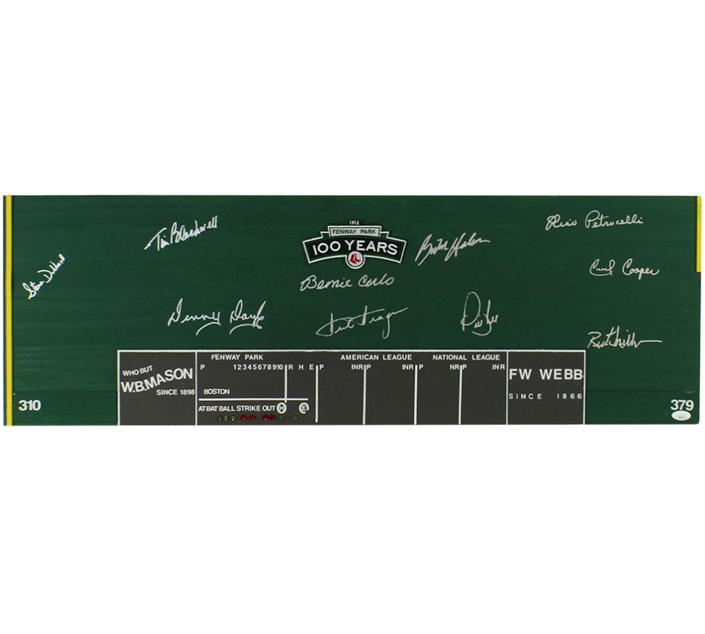 Board measures 12" x 36" in size and has been hand-signed by (10) members of the 1975 Boston Red Sox including Rico Petrocelli, Steve Dillard, Tim Blackwell, Denny Doyle, Bernie Carbo, Butch Hobson, Bill Lee, Cecil Cooper, Rick Miller, and Dick Drago. Board also features a Red Sox 100 Years patch.