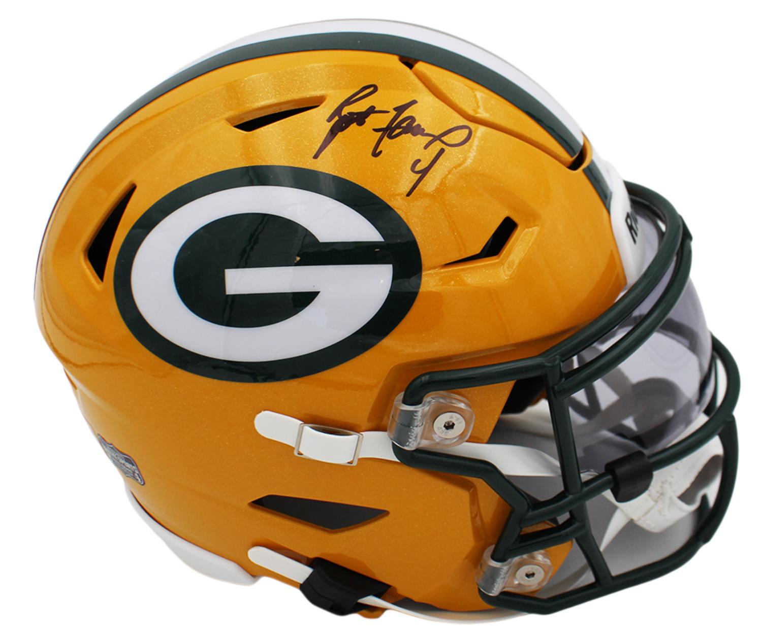 Riddell Green Bay Packers full-size authentic on-field speedflex helmet. Helmet has been hand-signed by Brett Favre (HOF).
