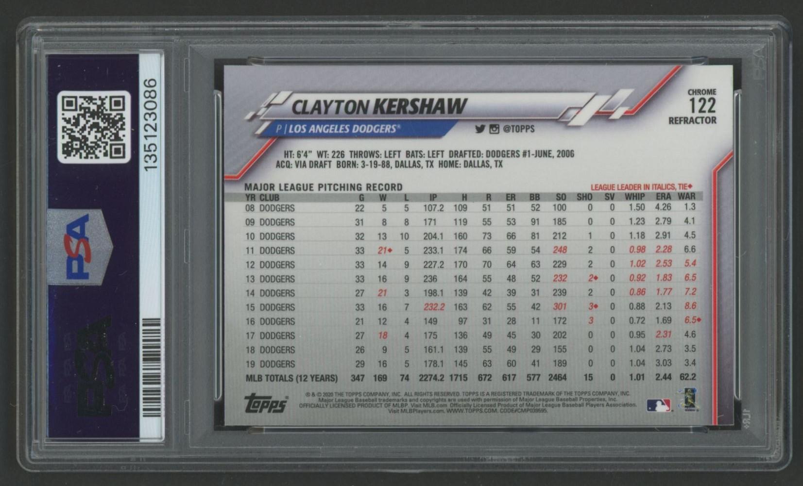 Clayton Kershaw 2020 Topps Chrome Pink Refractor #122 (PSA 10)