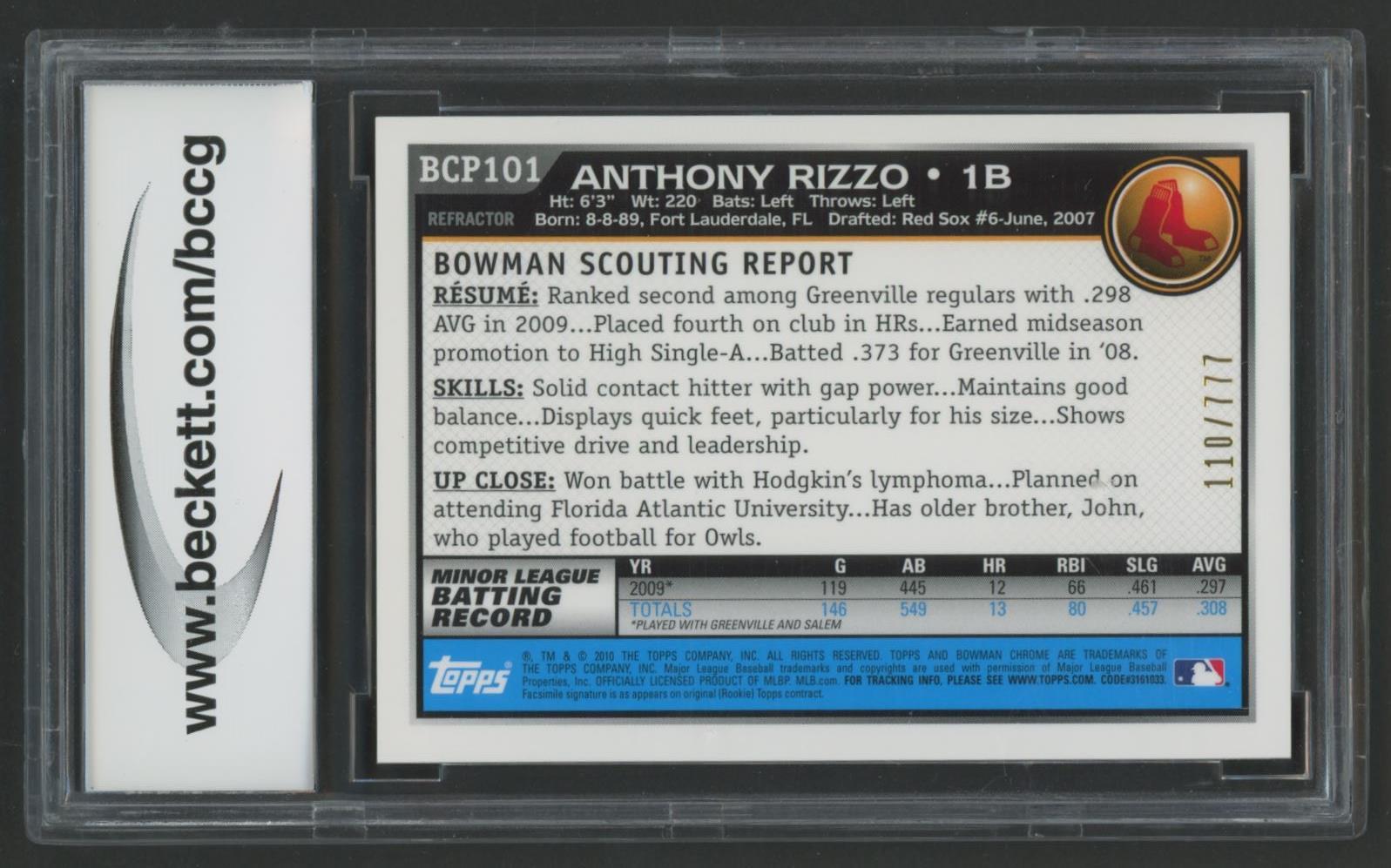 Anthony Rizzo 2010 Bowman Chrome Prospect Refractors #BCP101A #110/777 (BCCG 10)