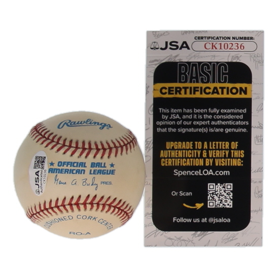 Rawlings Official American League Baseball. Hand-signed and inscribed by Bo Belinsky (D. 2001, Los Angeles Angels). Please note, the baseball is naturally toned and stained.