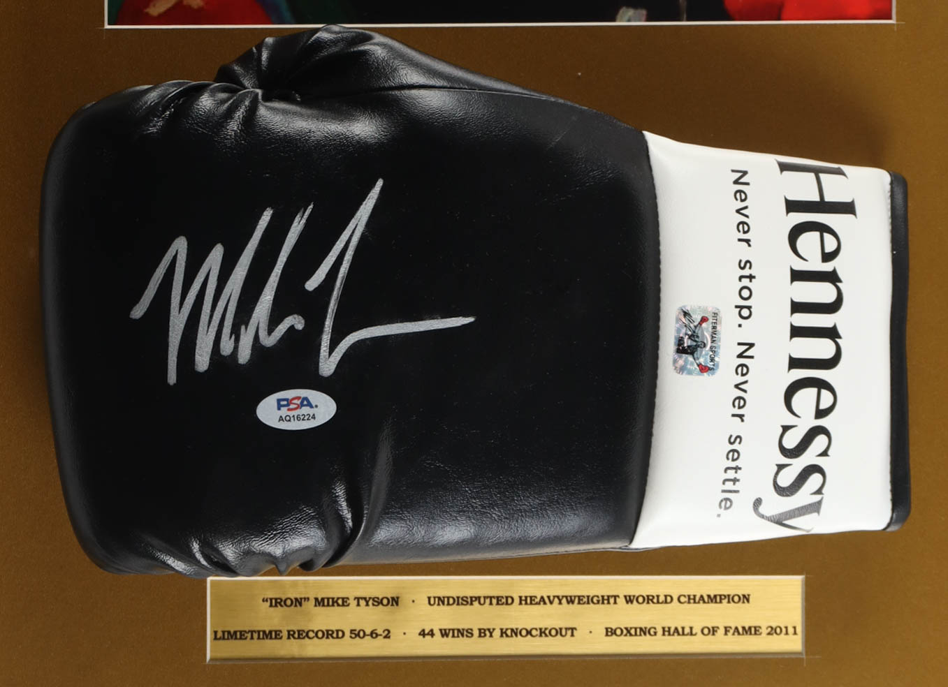 Custom frame measures approximately 17" x 30" in size. Hennessy boxing glove is hand-signed by Mike Tyson (HOF). Display also features a Mike Tyson art print.