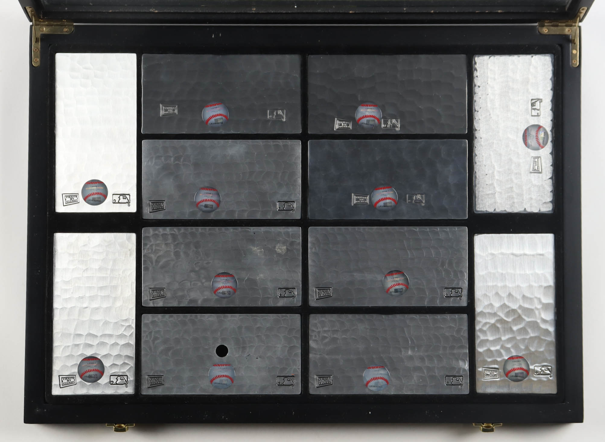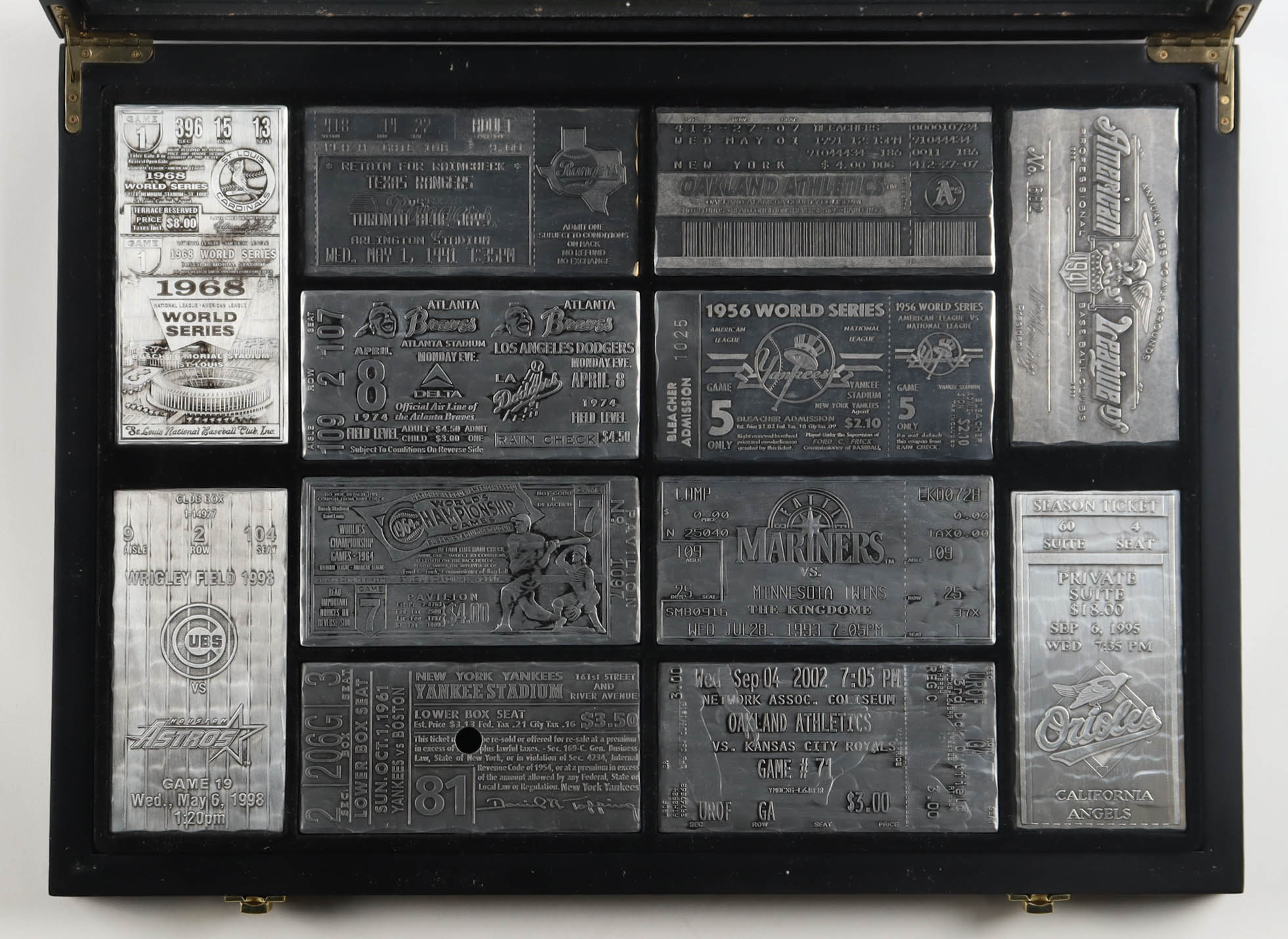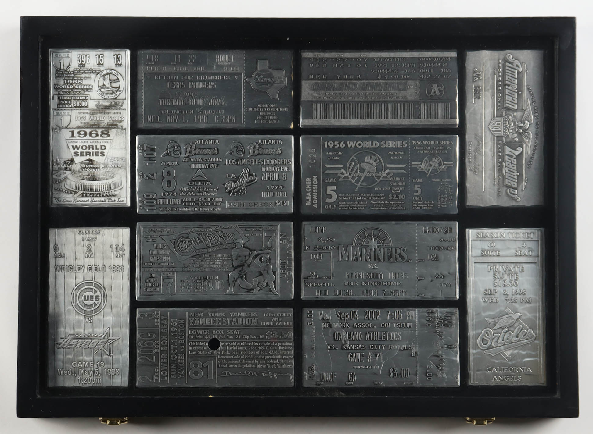Custom shadowbox frame measures approximately 16" x 20" x 2.5" in size. Display contains (12) commemorative metal tickets.