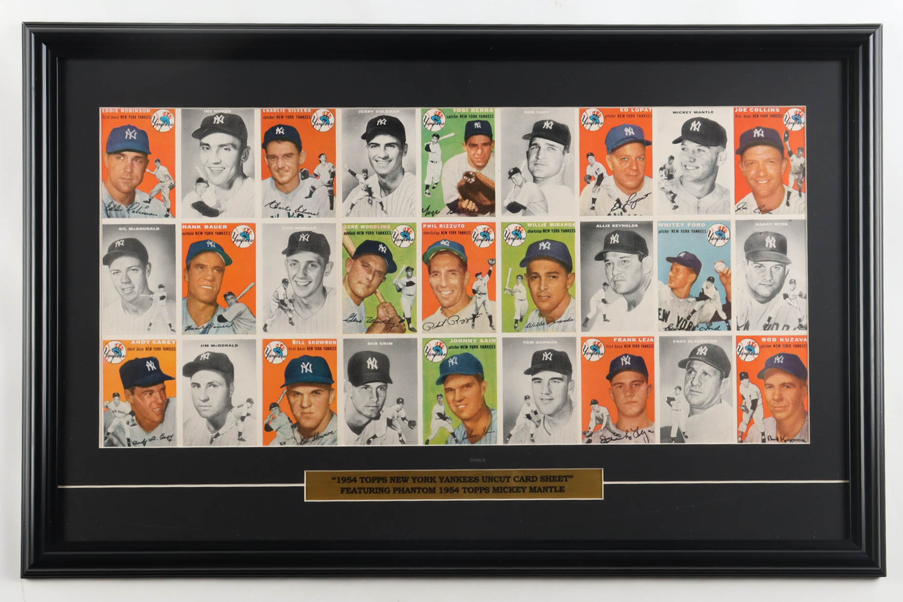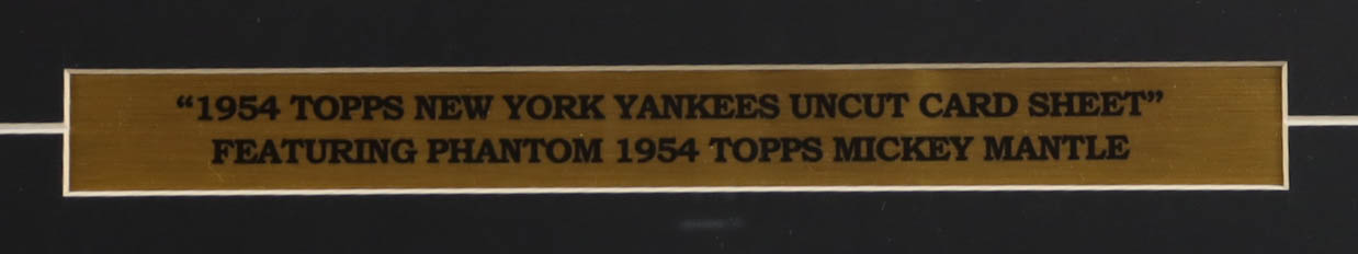 Custom framed display measures approximately 18" x 28" in size and features an uncut sheet of 1954 Topps New York Yankees baseball cards. The display also includes a title plaque. Please note that the item is unsigned. Please see photos for details regarding the condition of the item.