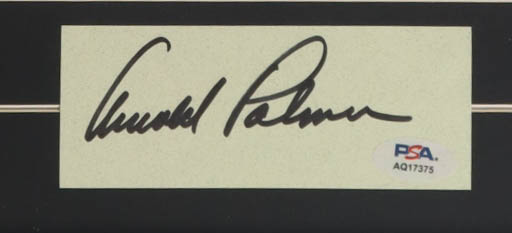 Custom frame measures approximately 17" x 18" in size and features a cut that has been hand-signed by Arnold Palmer (D. 2016, HOF). Display also includes an unsigned LeRoy Neiman (D. 2012) art print.